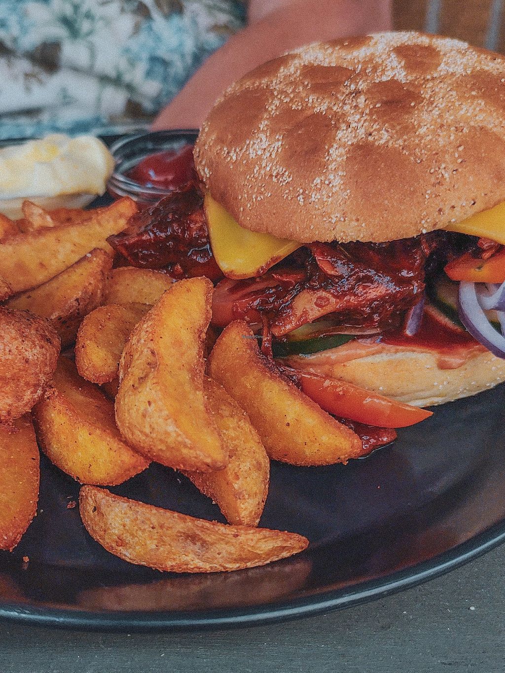 The burger was really good too, I personally love soy meat (and Oumph in particular), it was perfectly marinated in barbecue sauce, with nice toppings and crispy potato wedges.