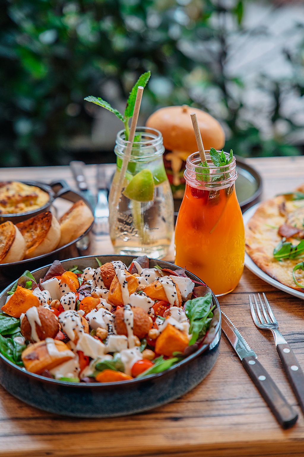 Barbie Kuh mit homemade BBQ & Sweet Onion Soße, Salat, veganem "Beef" …