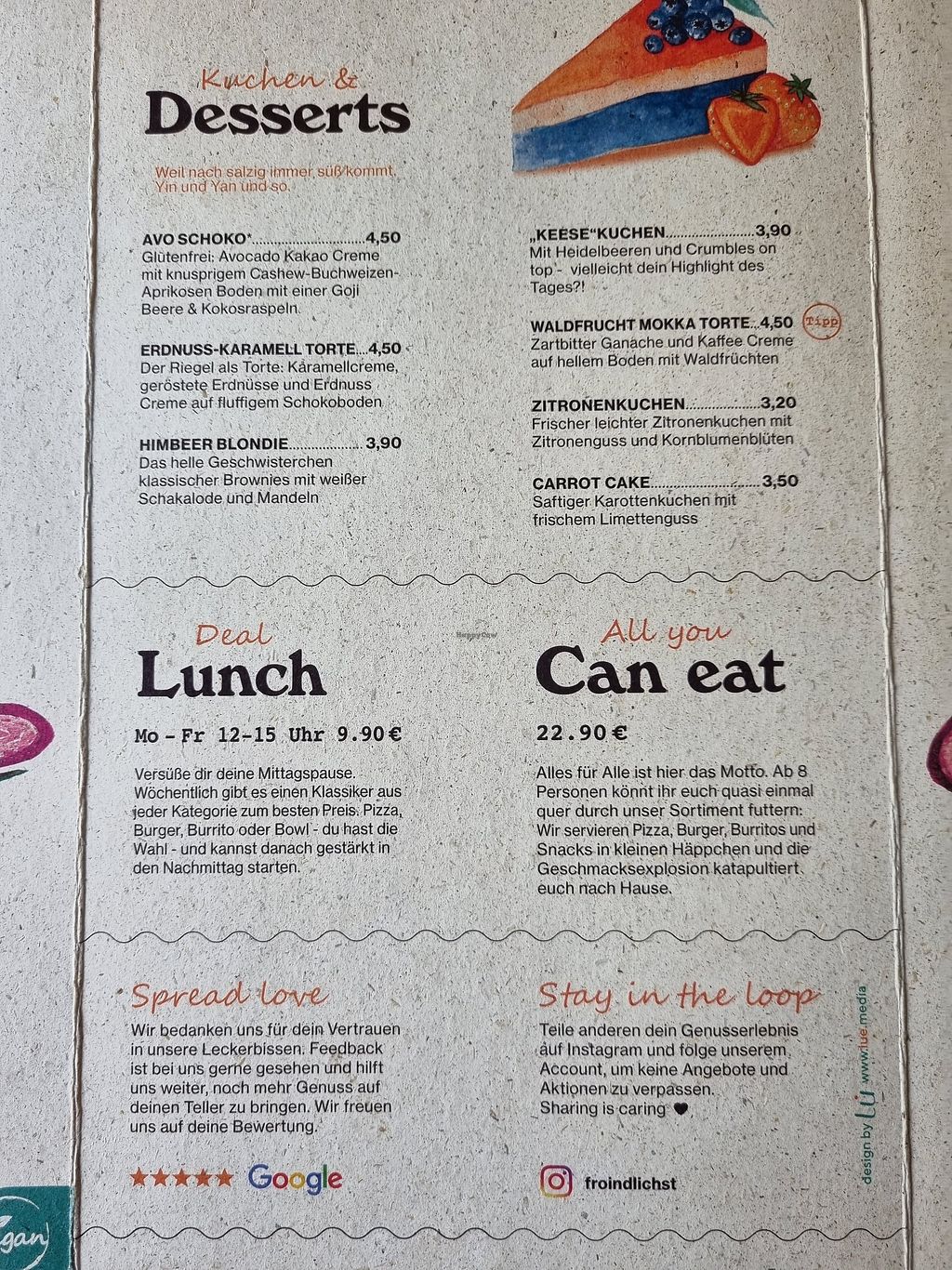 During lockdown the Sunday brunchbox is an amazing substitute for not being able to visit the Froindlichst on site. The boxes hold different kinds of breads and spreads, Marmelade, chocolate and fruits. Also it comes with cakes and vegetables and holds a small casserole. The ingredients change every week so ordering the box every Sunday won’t get boring. I love it so much, i hope they’ll keep this service after restaurants will be open again.