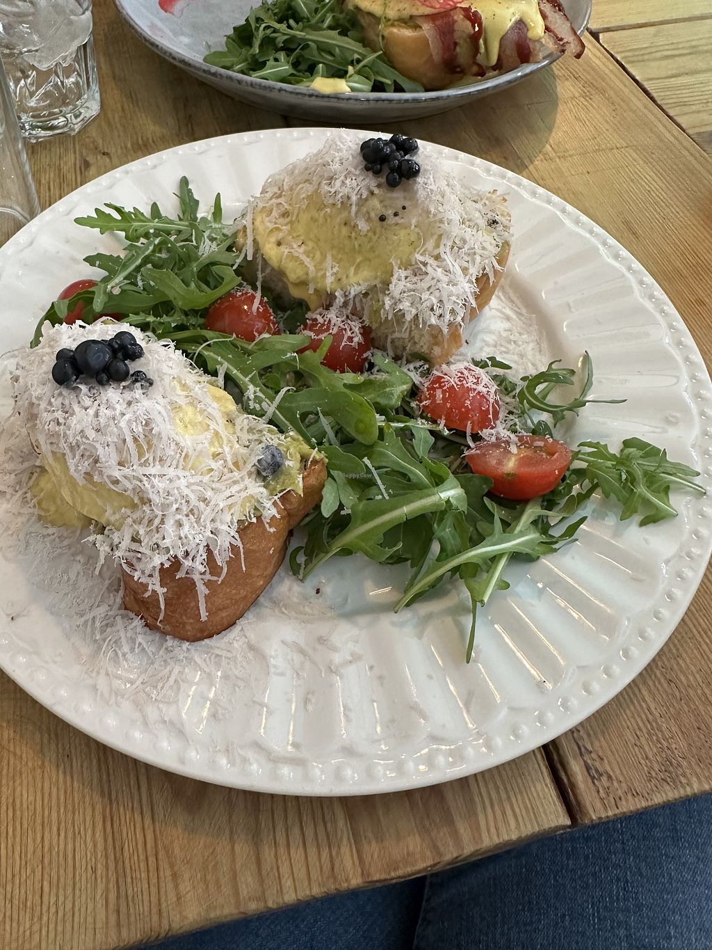 Restaurante especializado en brunch con huevos Benedict. Tengo que decir que a mí los huevos me han parecido un poco sosos si los comes de forma aislada, pero mezclados con sus acompañamientos (las tostadas u otras guarniciones) ganan muchísimo. Las tostadas de debajo estaban riquísimas, con su punto justo de tueste y saborcito a mantequilla, y el resto de salsas y demás preparaciones también de 10. Los postres que hemos pedido (tarta de queso con creme brulé y tarta de zanahoria) también espectaculares. Me he quedado con las ganas de probar alguna torrija, pero justo se les habían terminado, así que tendremos que volver otro día para probarlas.