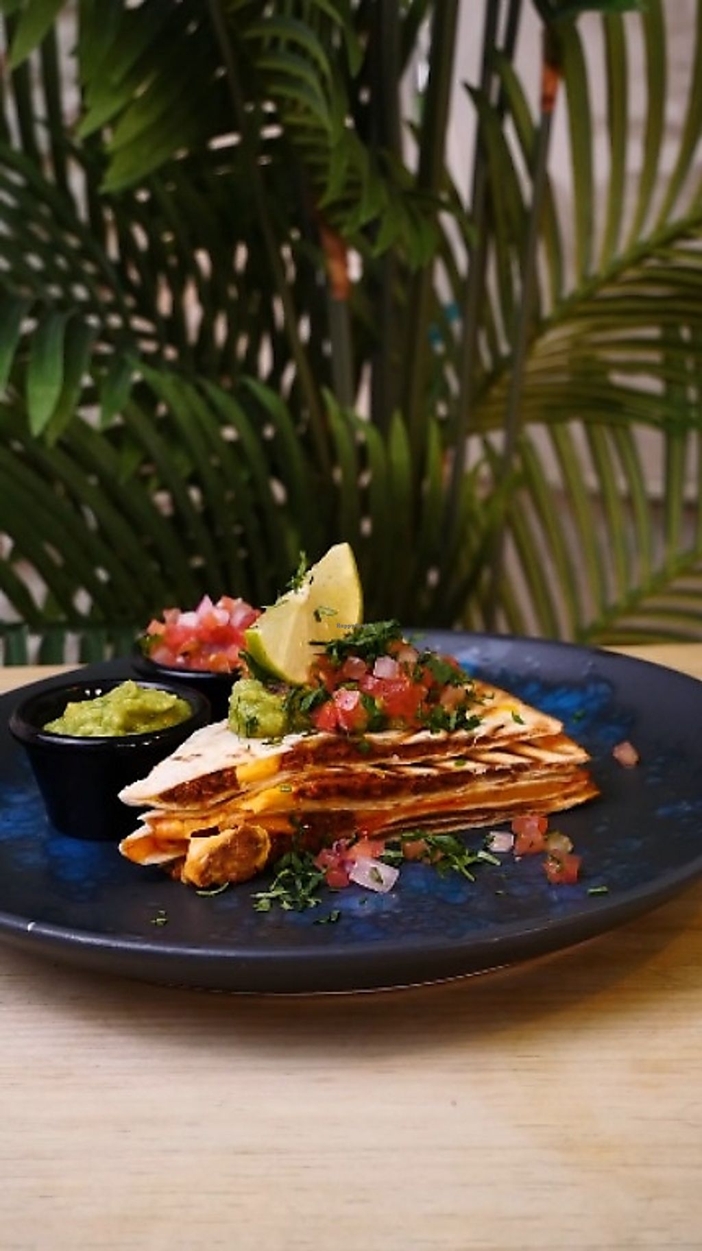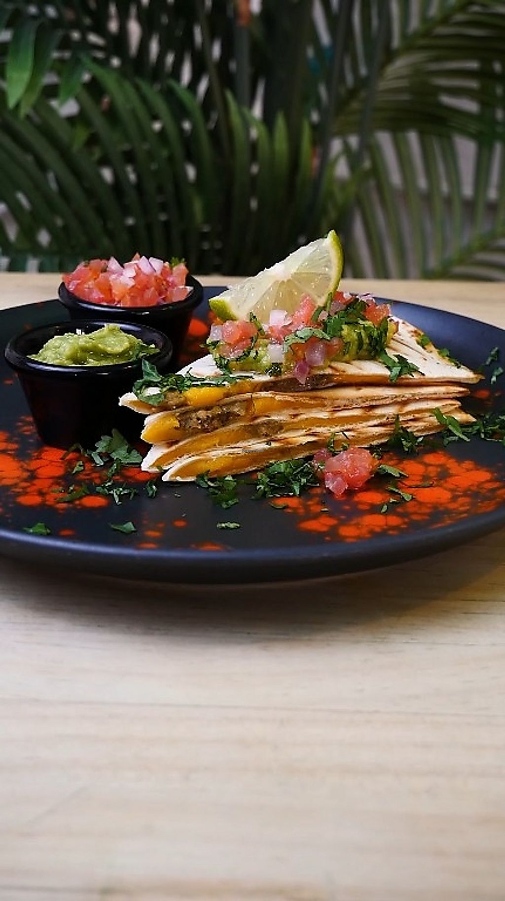 VEGAN CHORIZO QUESADILLAS with pico de gallo and avocado