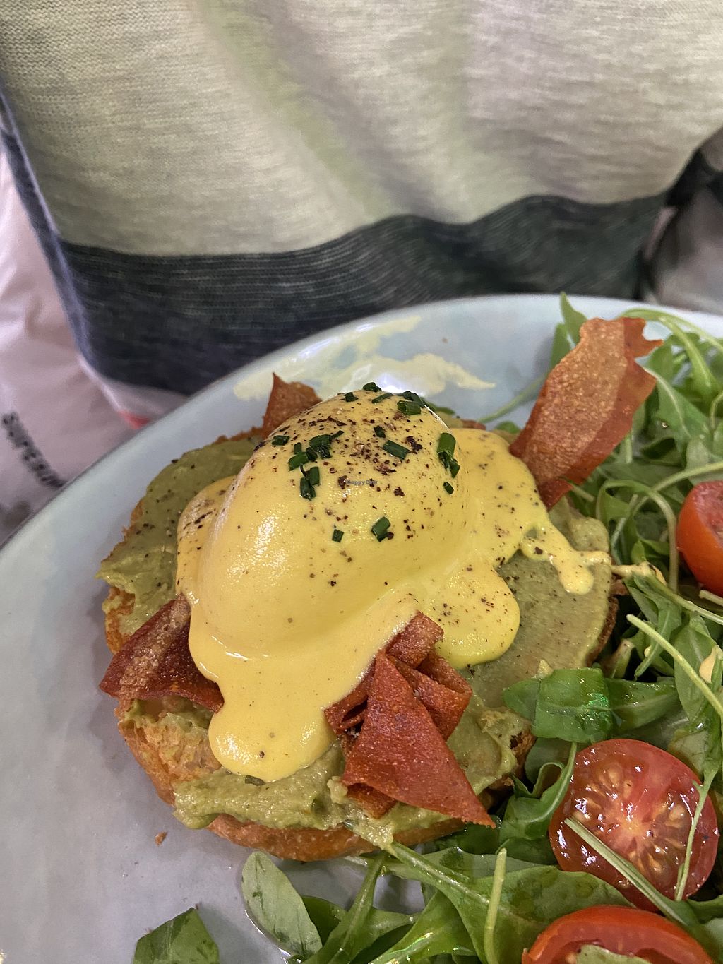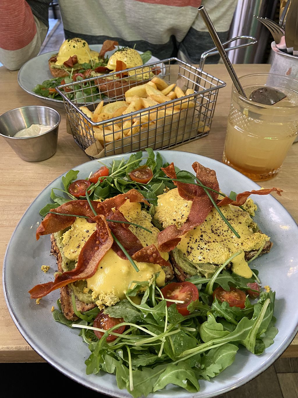 Su especialidad son los huevos benedictinos, probamos los clásicos y la versión de huevo vegano que han conseguido es fascinante. Pedimos también una de las ensaladas y era completísima. Salsas muy sabrosas. Local muy bonito y camareros amigables.