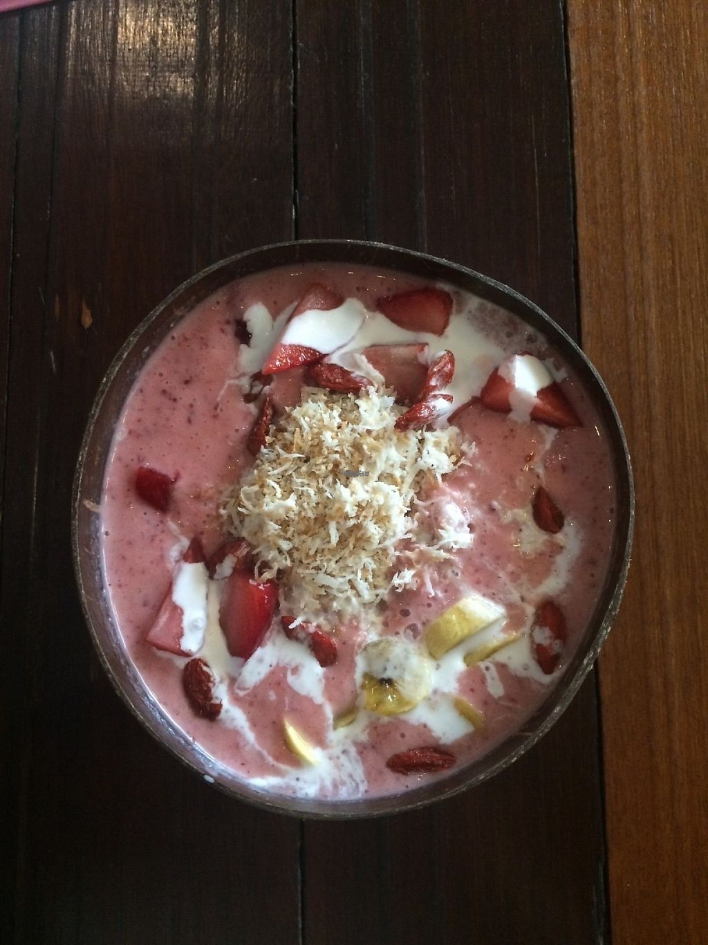Smoothie with tumeric (dont remember the name, sorry) and strawberry c…