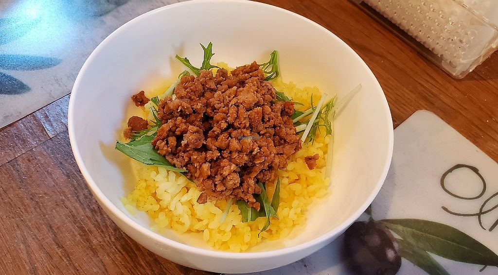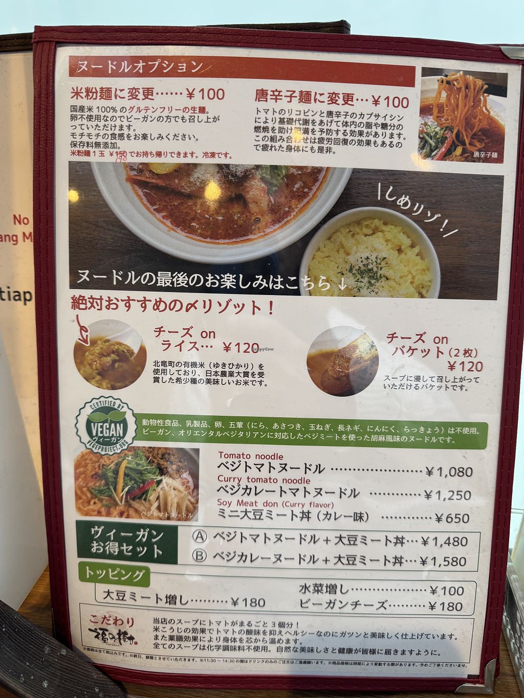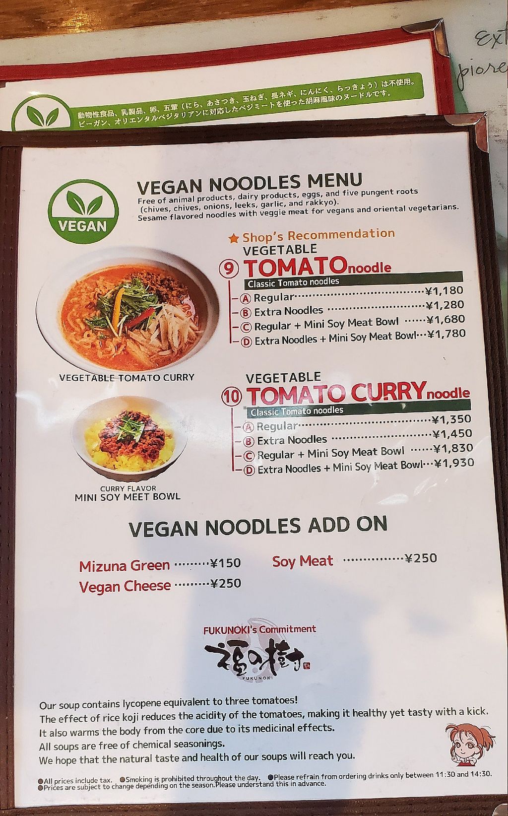 They have a vegan section on their Japanese menu but not on their English menu, so make sure you look at the right menu. All their soup is tomato based. They have two vegan options: ramen with soy meat, and curry ramen with soy meat. You can also order a set meal which comes with an additional bowl of rice with more soy meat which you can eat with the soup like a risotto after finishing your noodles.