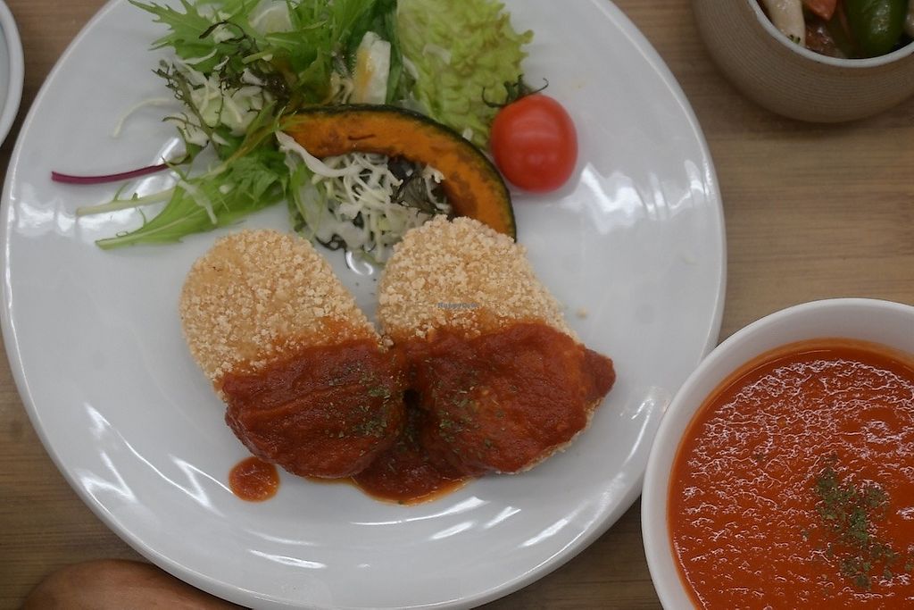 This place had the best croquettes I tried in Japan - crispy with a tangy sauce. The salad had a great dressing, and the vegan donuts (while they were more like muffins than donuts) were fantastic. At the attached little store, I also found some vegan items and the staff kindly checked the ingredients to confirm it was vegan for me (in Japanese). I bought a package of beautiful strawberries and they were just as delicious as they were pretty.