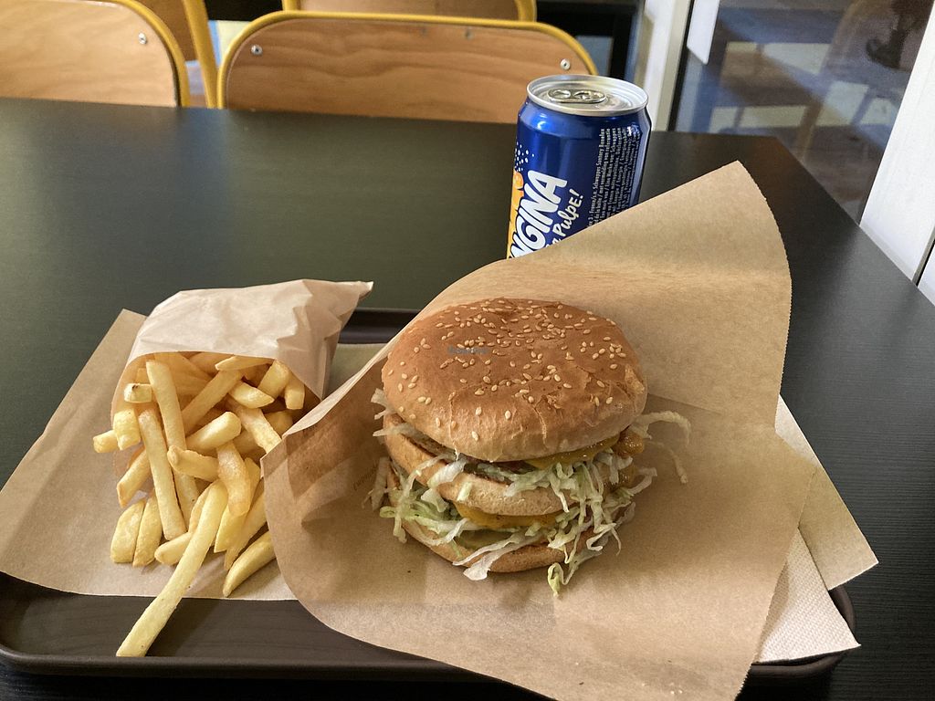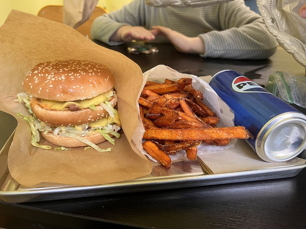 Double Furahaa burger, sweet potato fries and black soda (Pepsi)