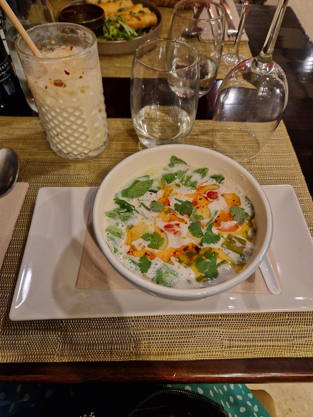 I had the tom kha soup and green curry. Both are coconut milk based. The soup was already a lot to eat and my stomache couldn't handle all the milk. Then the main course was also with coco milk, so I wasn't able to eat a lot. Too bad because both were very tasty. Nice atmosphere and friendly staff. But if you can't handle a lot of coconut milk then don't go for the soup :)