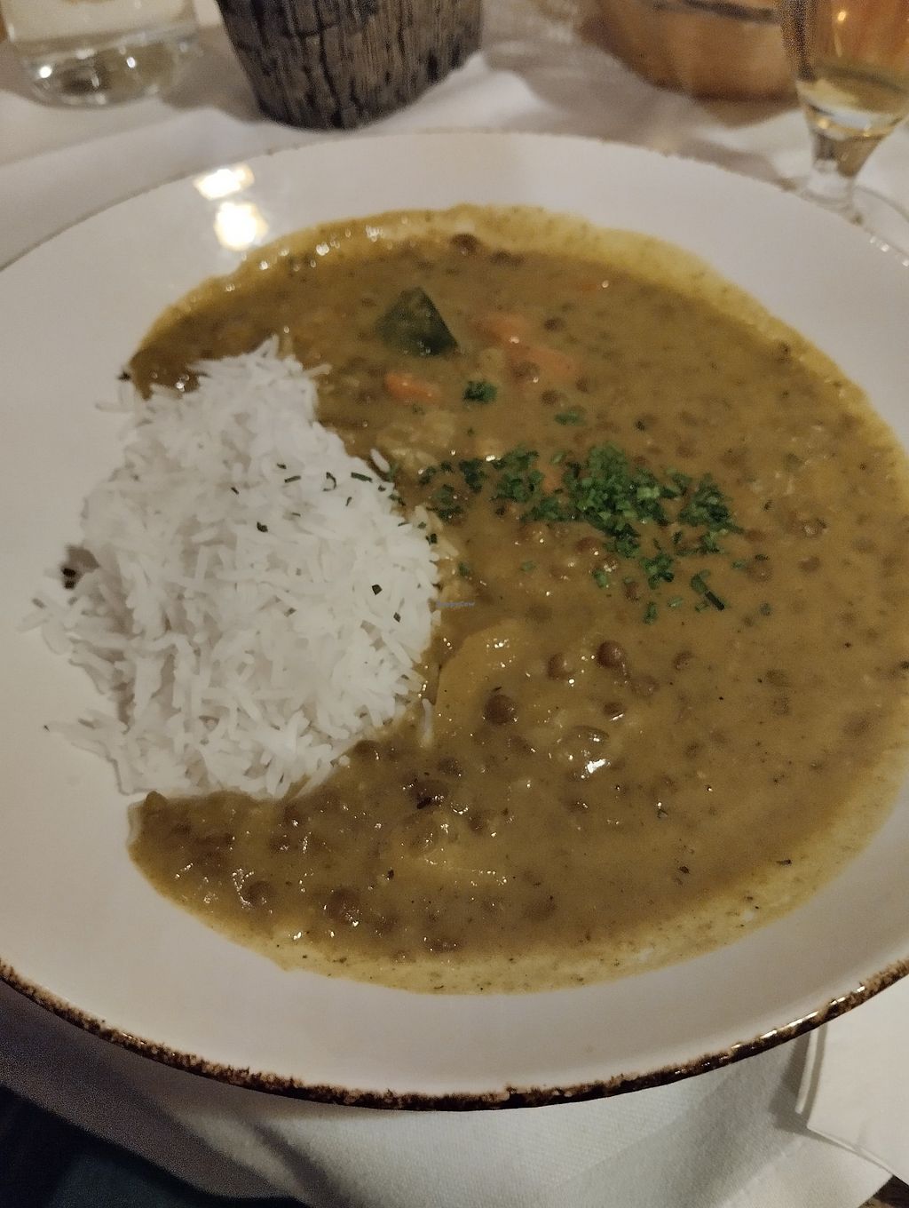 I had dinner here for four days during a school trip. We asked for a vegan and a vegetarian menu and they were very kind and thoughtful. We had three courses like the others and the food was really good. We had vegan soups, vegan burger with guacamole, lentil curry with rice, vegetables and salads.