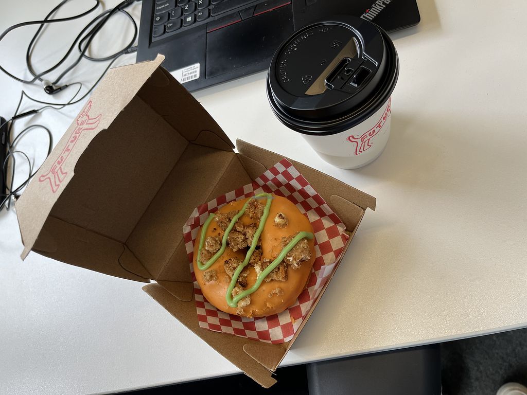 The doughnut is very interesting, spongey like mochi, light unlike doughnuts in general. Wasn't expecting this texture but I like it, partner didn't.