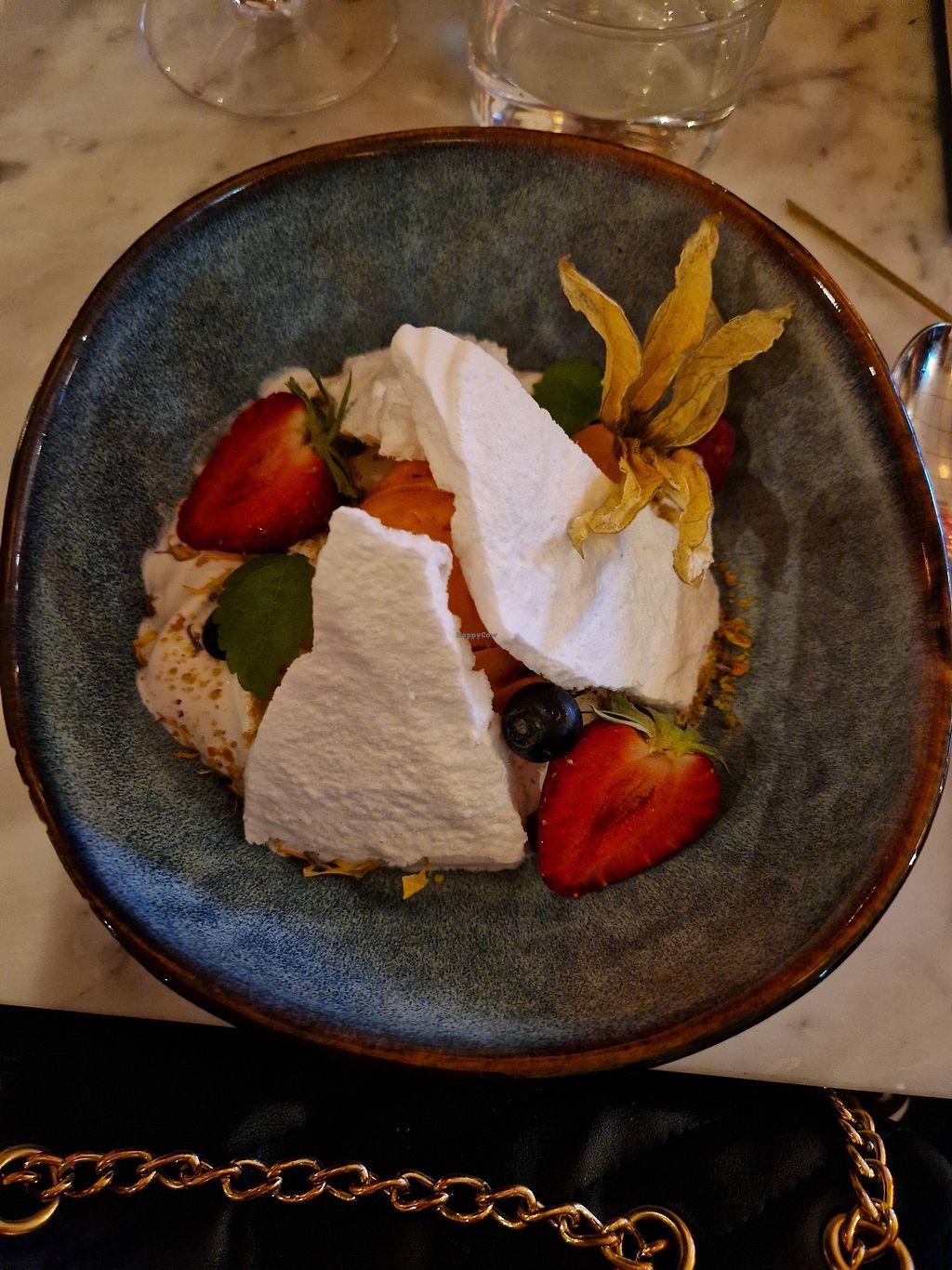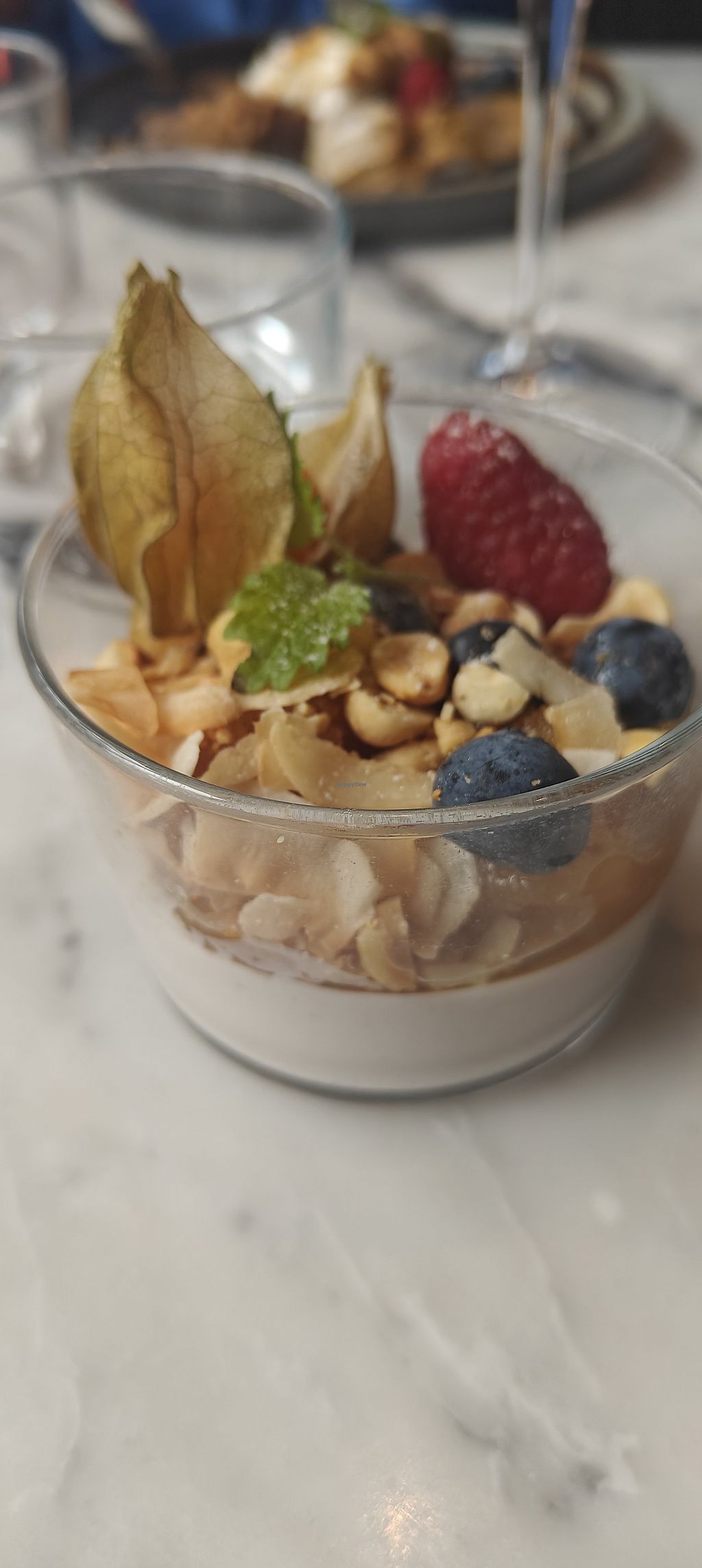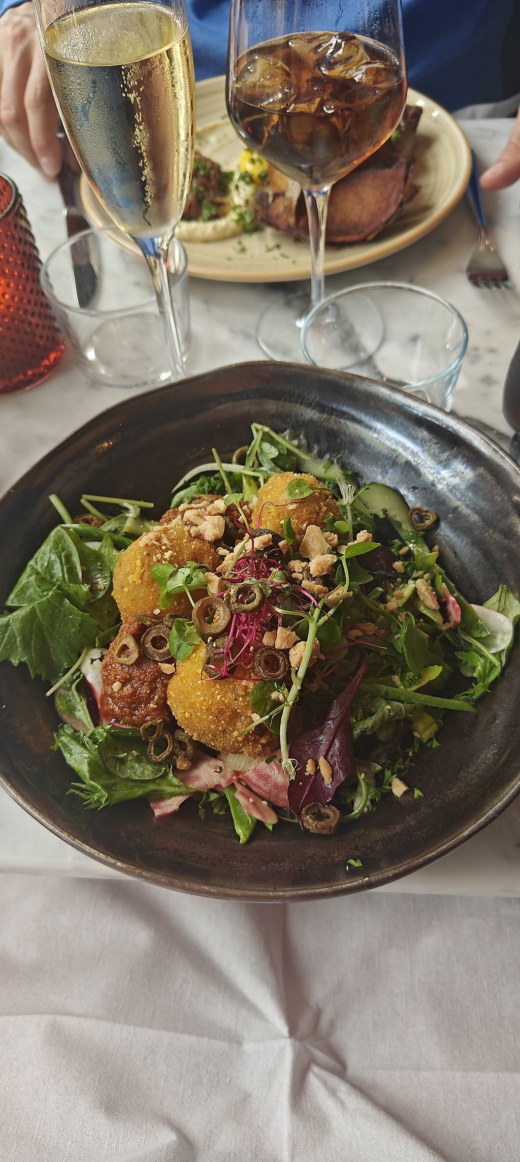 Very tasty main course which was fried balls of risotto with salad and pesto with nuts and dressing. The dessert was a coconut pannacotta with berries and pickled pineapple. They had a vegan burger on the menu and a vegan starter. Several vegan options to choose from.