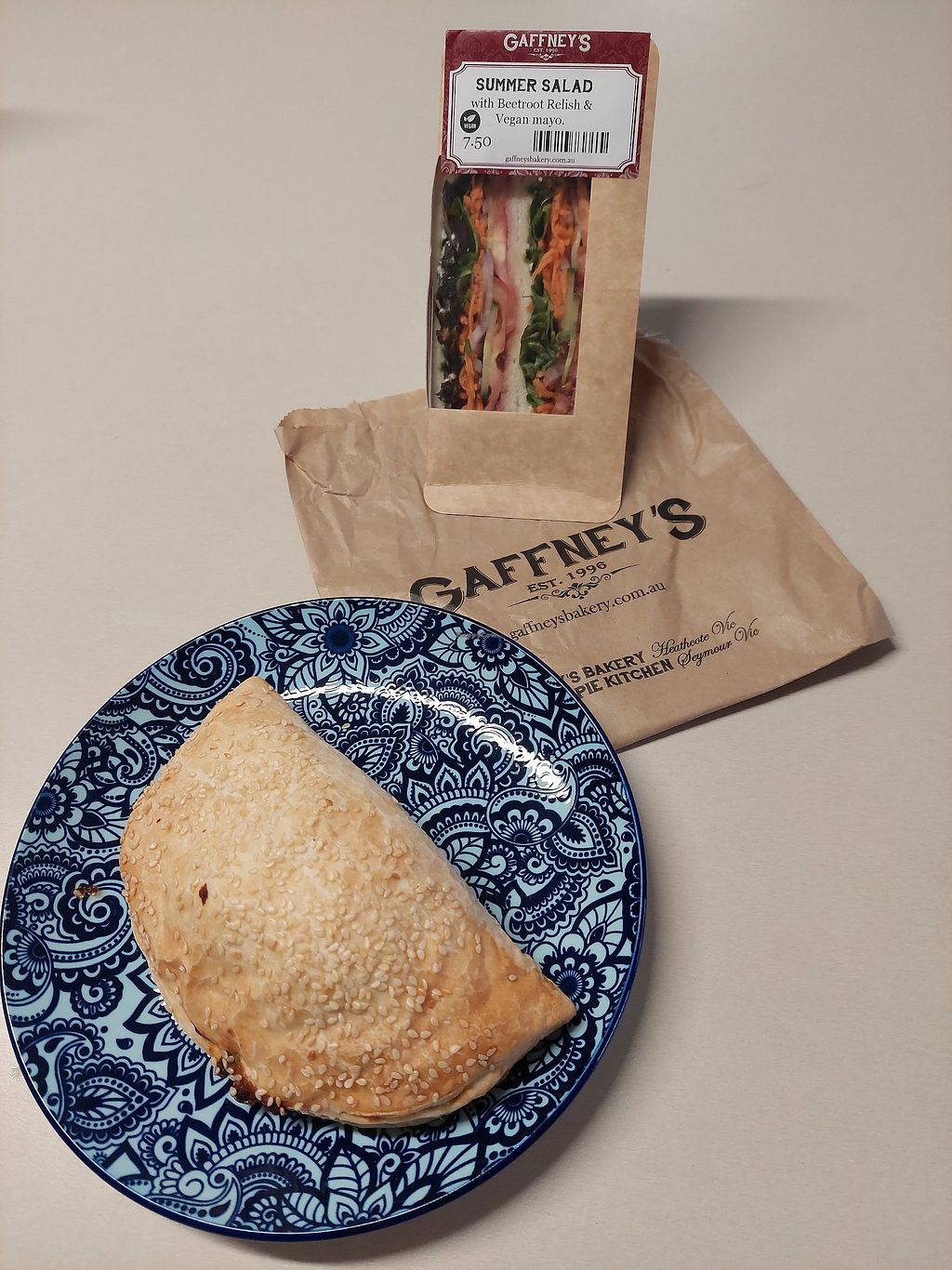 I went into Gaffneys Bakery in Seymour to get their delicious vegan roasted vegetables pastie and found that they also have a vegan salad sandwich. It looks fabulous - jam-packed with veg. Well done Gaffneys!! 🥰🧡💚