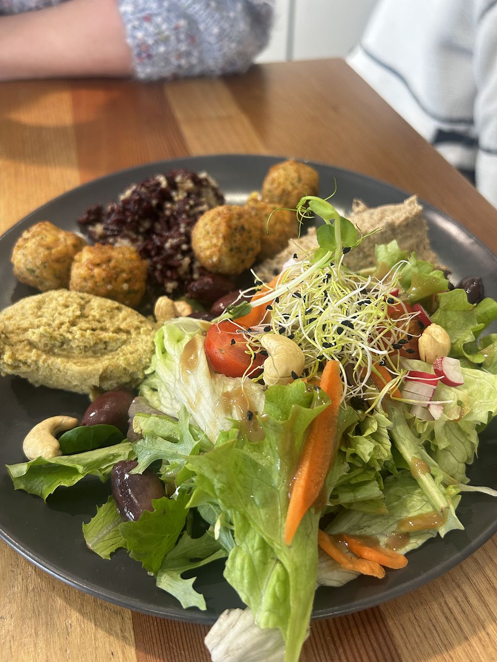 Not bad for this region. Allegedly, vegan haloumi salad — and of corse falafel. Close to train station.