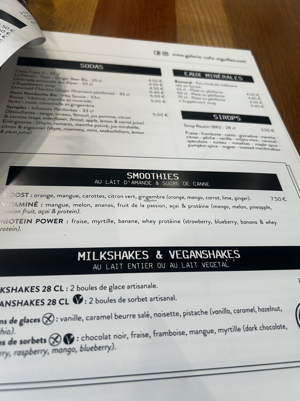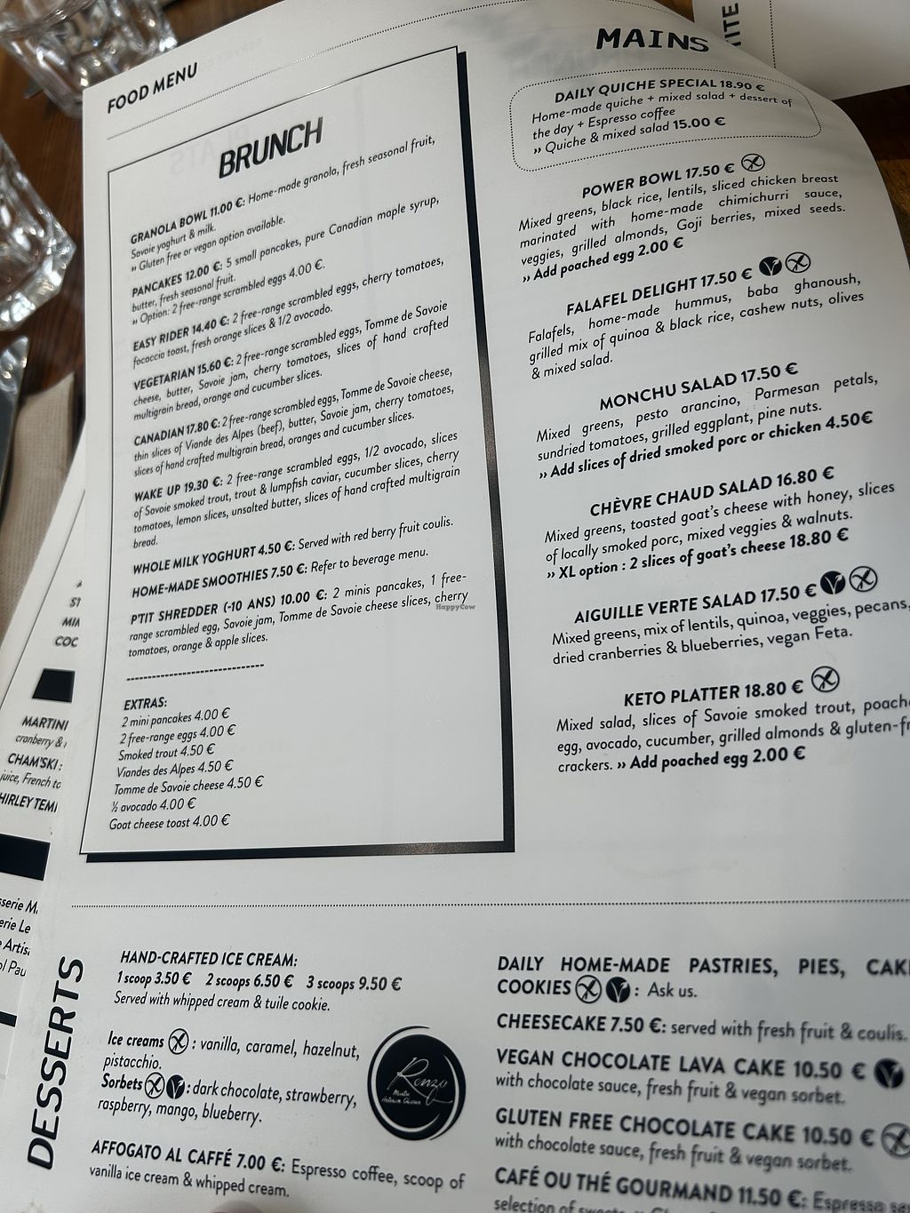 A few ice vegan options. We had the soup to the day (request no cheese with bread when ordering the soup) and the falafel salad. Good wholesome ingredients and good flavours. Standard prices for Chamonix. Very nice service and pleasant interior.