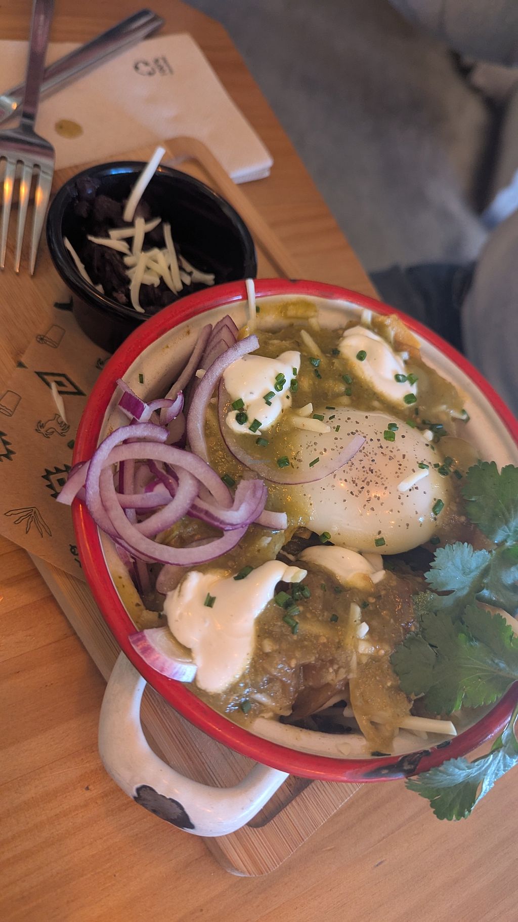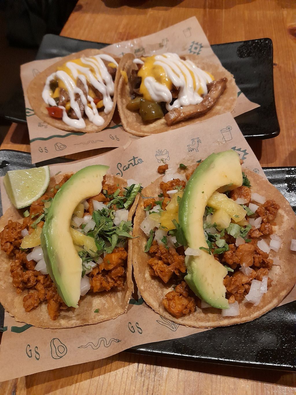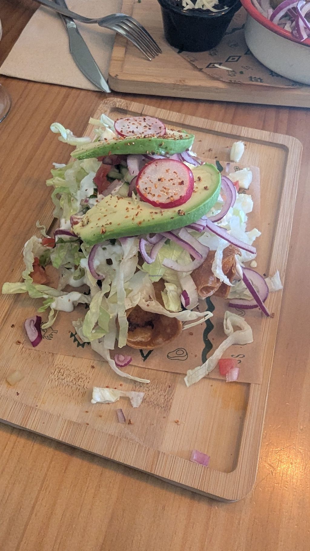 Nachos with vegan cheese, black beans, jalapeños, soy cream and "Pico …
