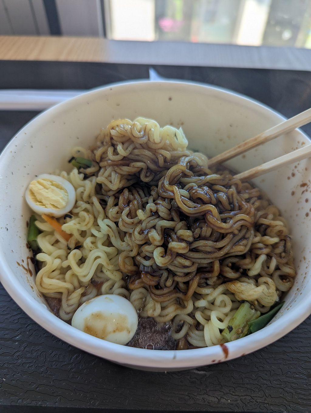 The staff was friendly and the vegan options are clearly marked (as shown on the picture of the menu posted here), however I ordered the Jajangmyeon and it came with two small eggs. I can only assume these are quail eggs. They tasted shockingly shockingly like real eggs and the color and texture was a dead match, so I assume these are not fake vegan 'eggs' otherwise this place would be more popular and famous.