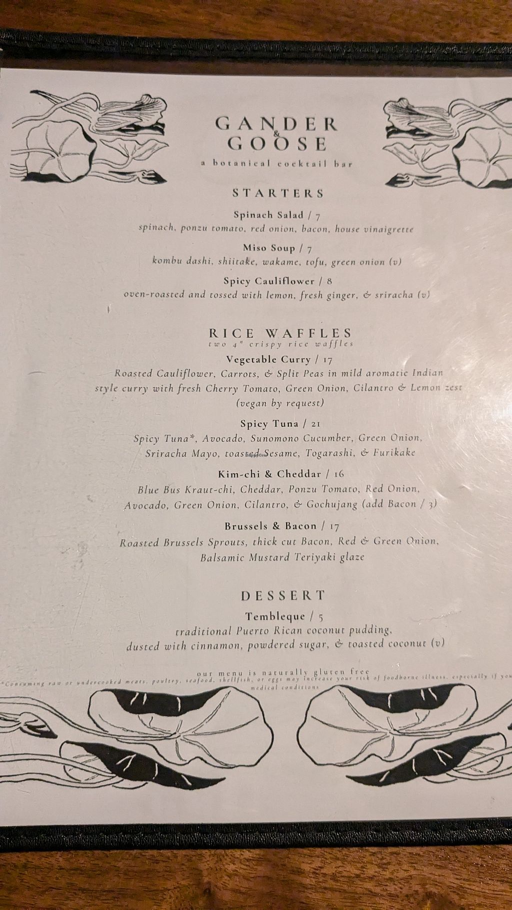 Serves meat, vegan options available. A botanical cocktail bar. Vegan appetizers may include spicy cauliflower and miso soup. Vegan mains may include a vegetable curry that can be made vegan; the spicy tuna can be swapped for cauliflower and vegan mayo (not listed on menu, server informed us). The kimchi can be made without cheddar as well. The only dessert offering is vegan. Open Wed-Sat 4:00pm-10:00pm, Sun 4:00pm-9:00pm. Closed Mon & Tue.