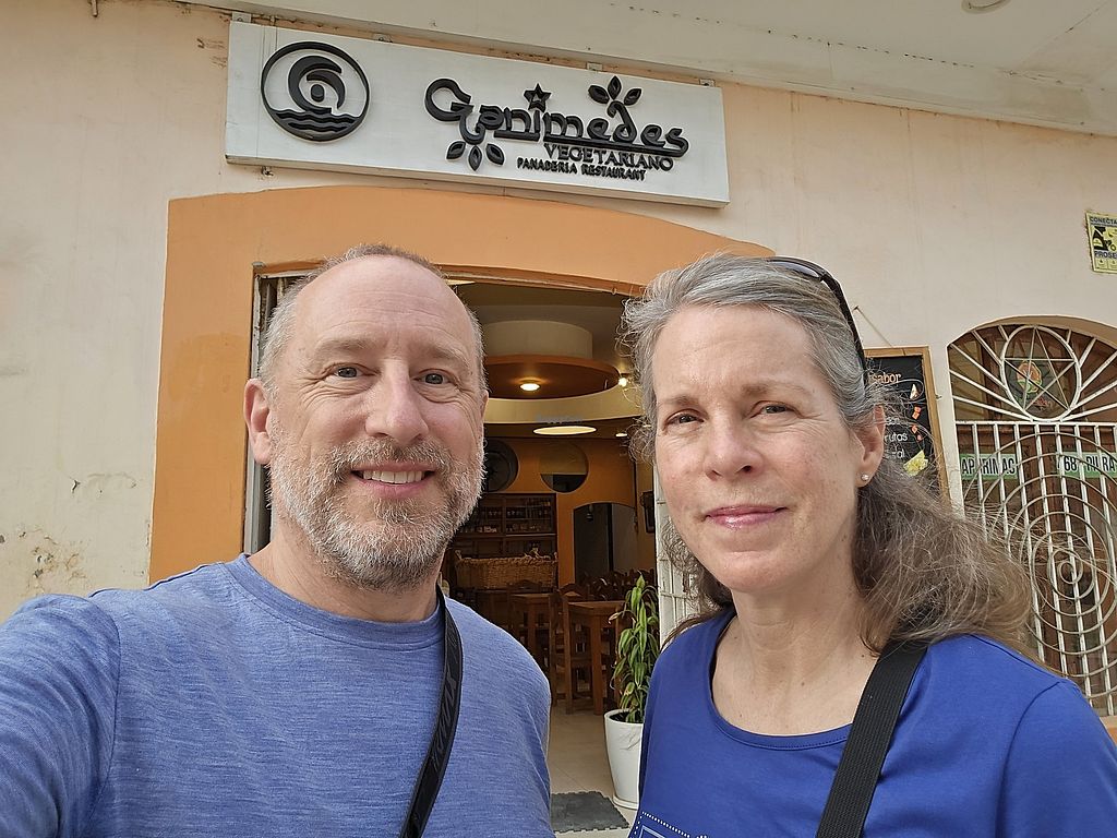 Comimos el menu vegetariano en Ganimedes que está 12 Soles y viene con entrada, plato de fondo, refresco y postre. Fue rico pero poco y ese dia solo era arroz con salsa de brocoli, no hubo mucha variación. Tienen varios kekes y tortas que se puede comer de postre y los platos a la carta parecen extraordinarios y interesantes.