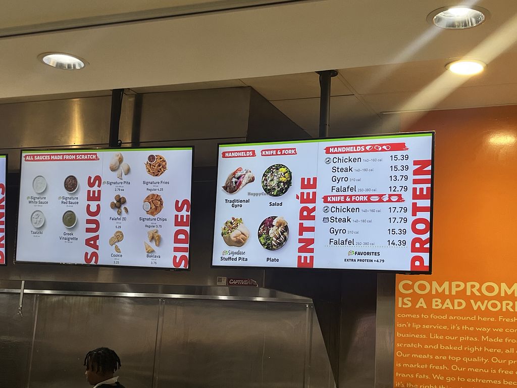 Serves meat, vegan options available. Quick service restaurant chain offering Mediterranean fare with plates, wraps, salads, and stuffed pitas which all are customizable. Build your meal as you walk the line selecting the ingredients and sauces you'd like. Fillings include falafel, mushrooms, hummus, tabbouleh, and various veggies. Vegan sauces are Greek dressing, tahini, cilantro, and red sauce. Handheld breads are vegan. Drinks are tea, soda, lemonade. Open Mon-Sun 10:00am-10:00pm.