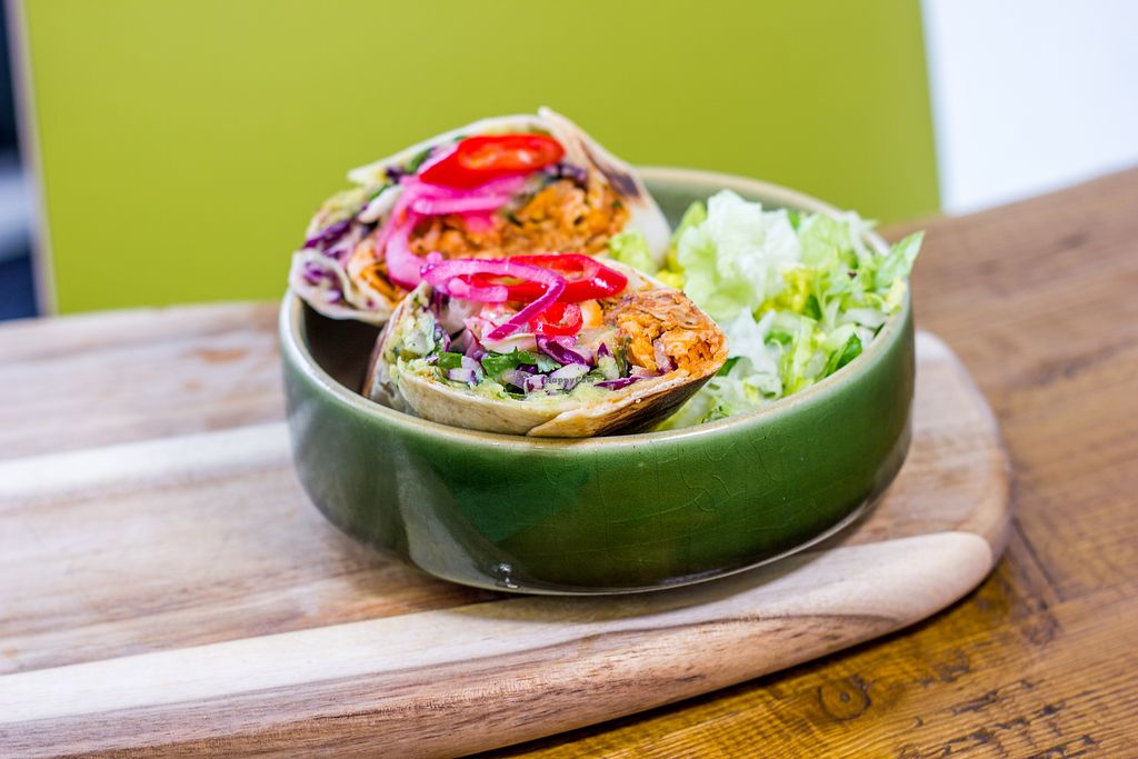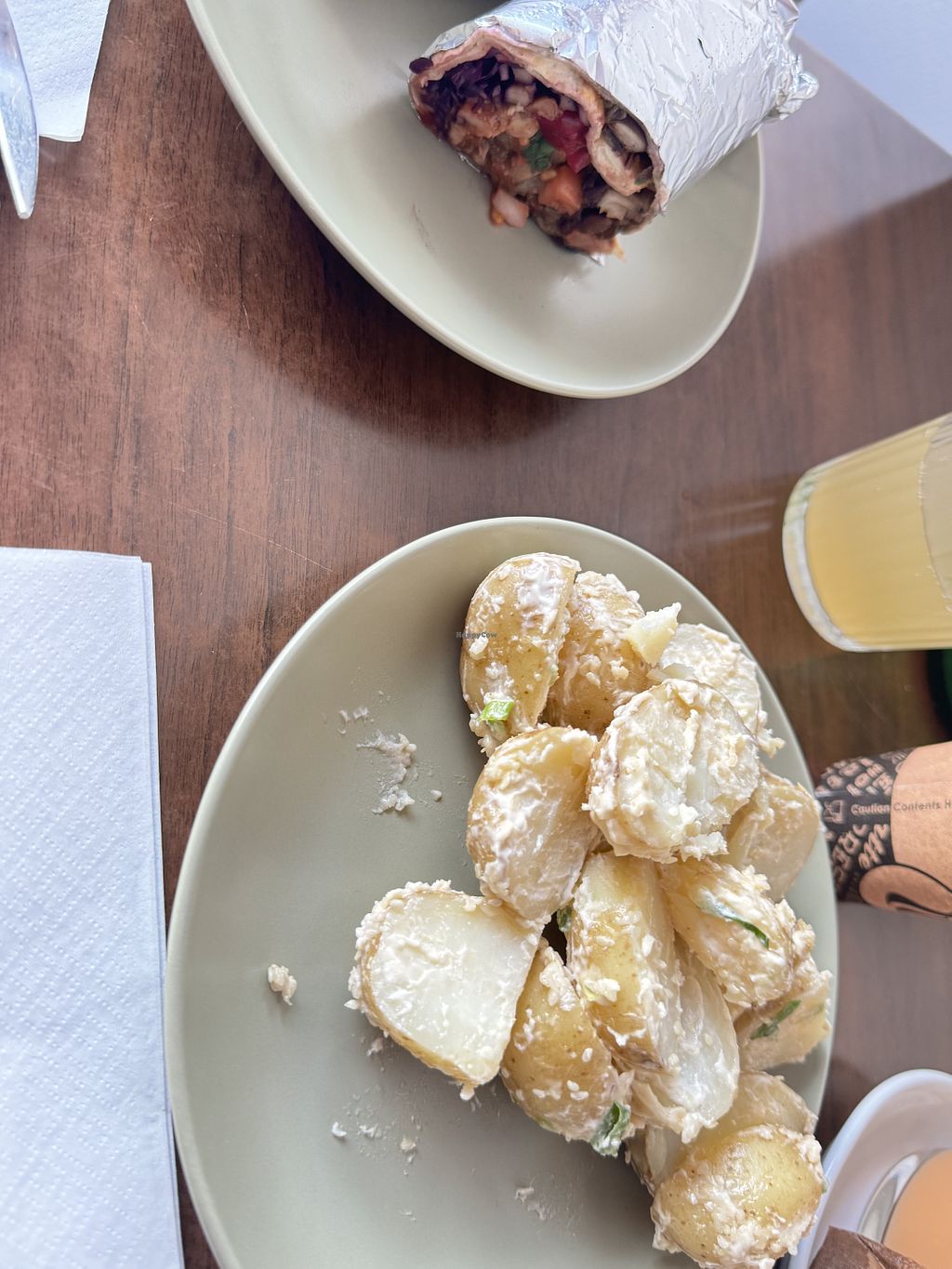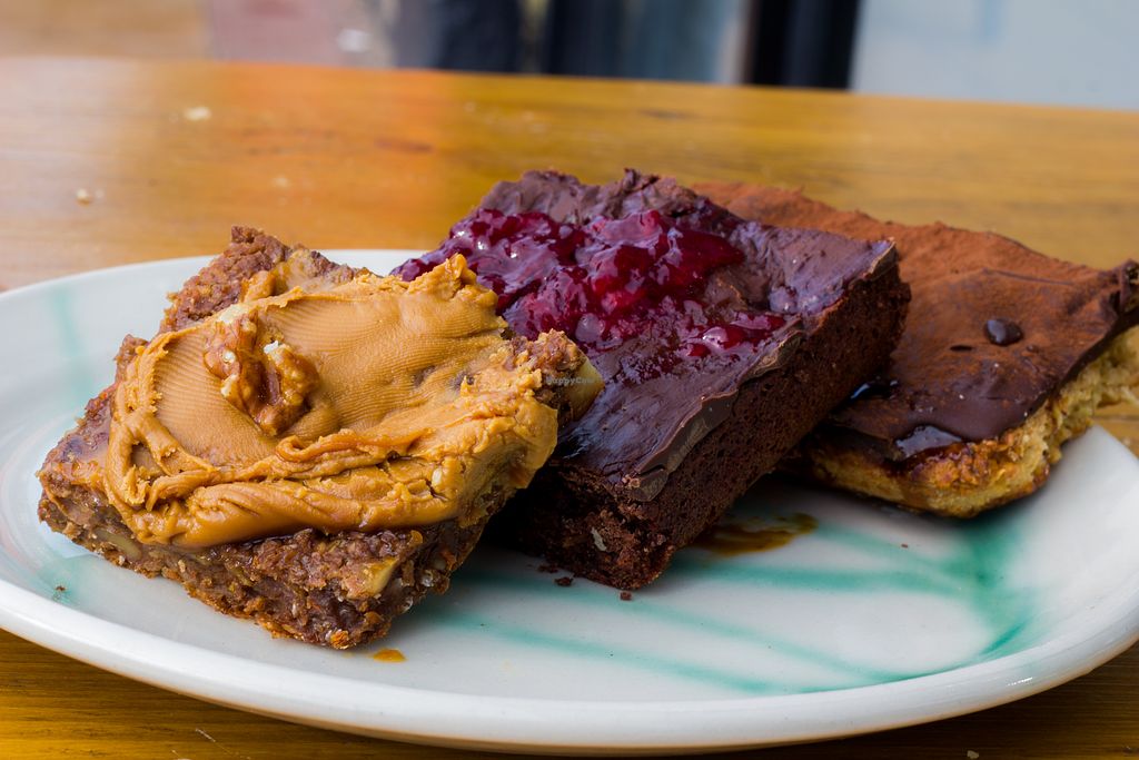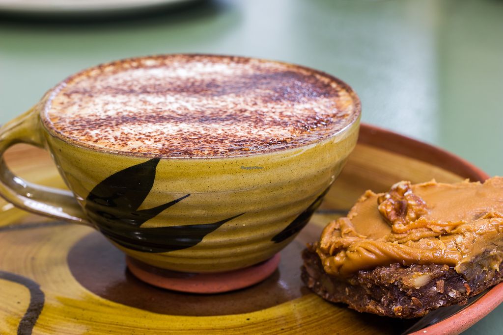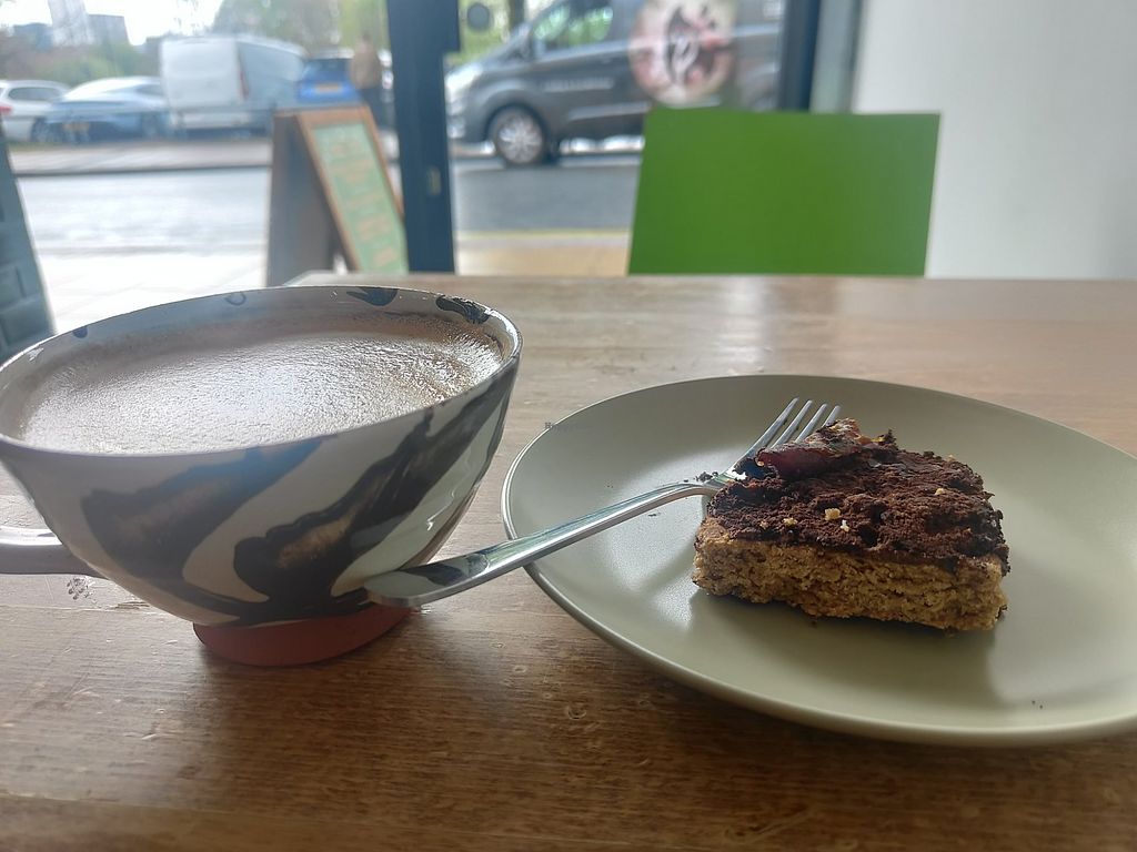 Peanut butter, date and chocolate flapjack with oat milk cappuccino