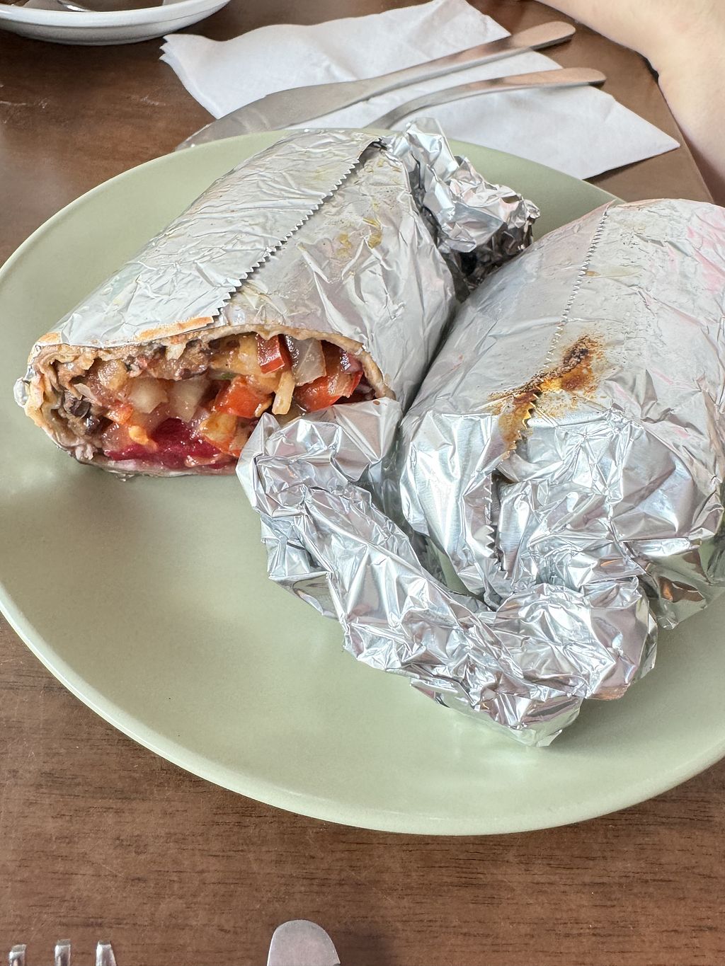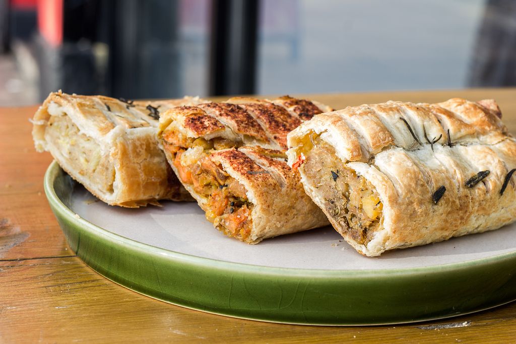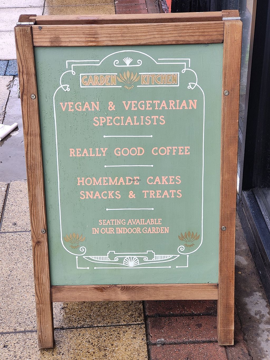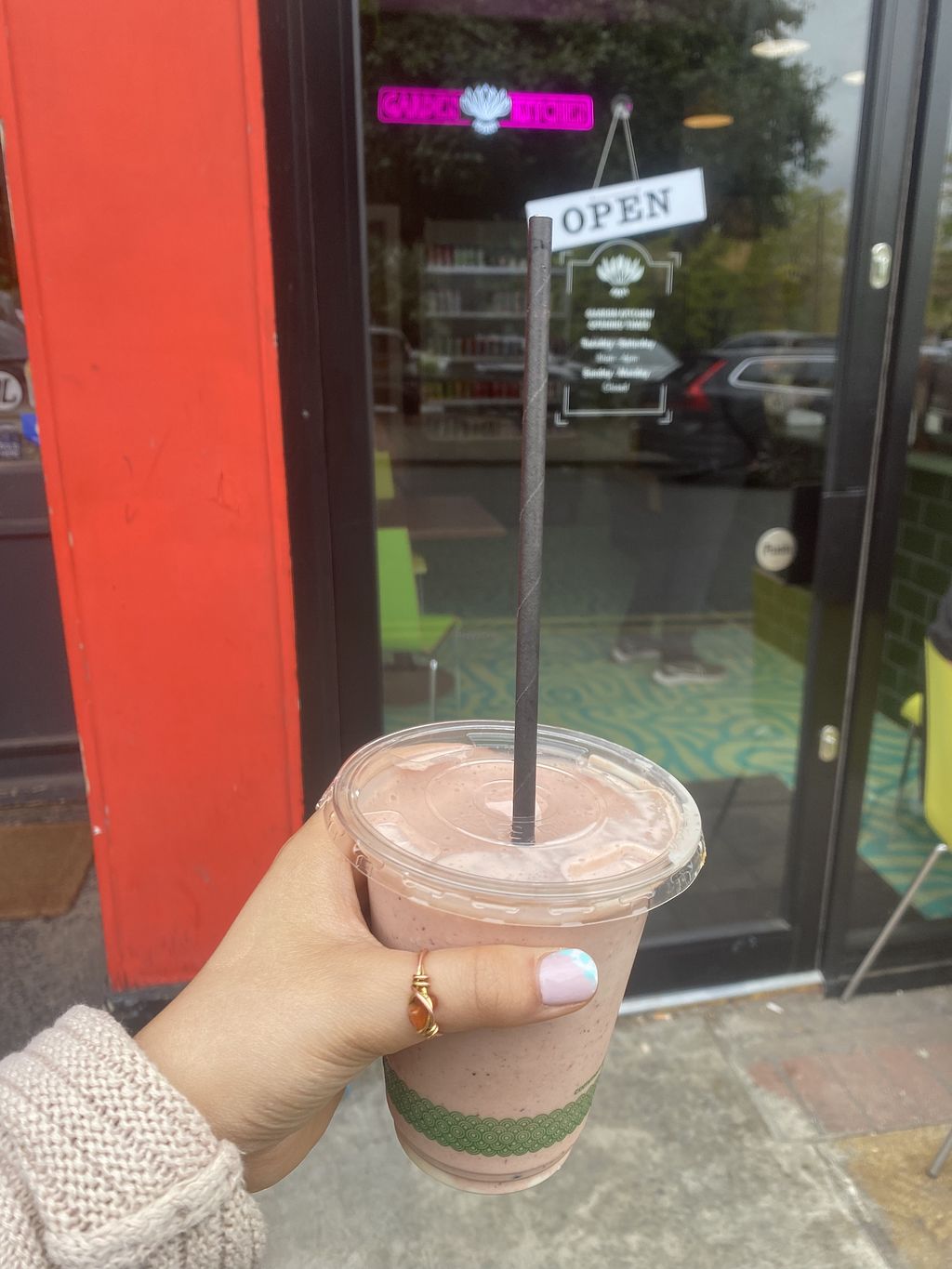 Peanut butter, date and chocolate flapjack with oat milk cappuccino
