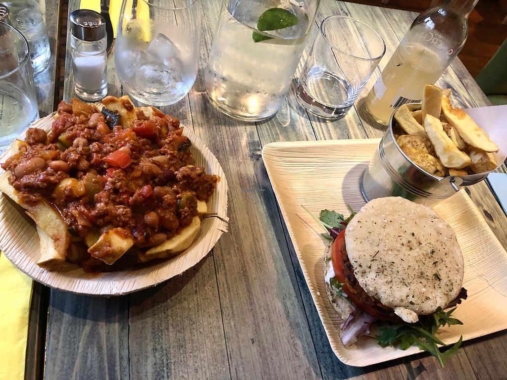 bean chilli with rice, 'burger with attitude' and hand-cut chips