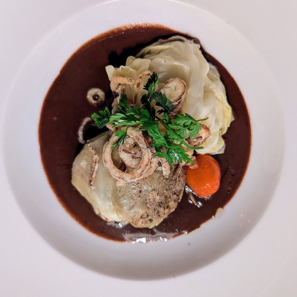 Selleriemedaillons unter der Kräuterkruste auf Rotkrautjus, mit Brezel…