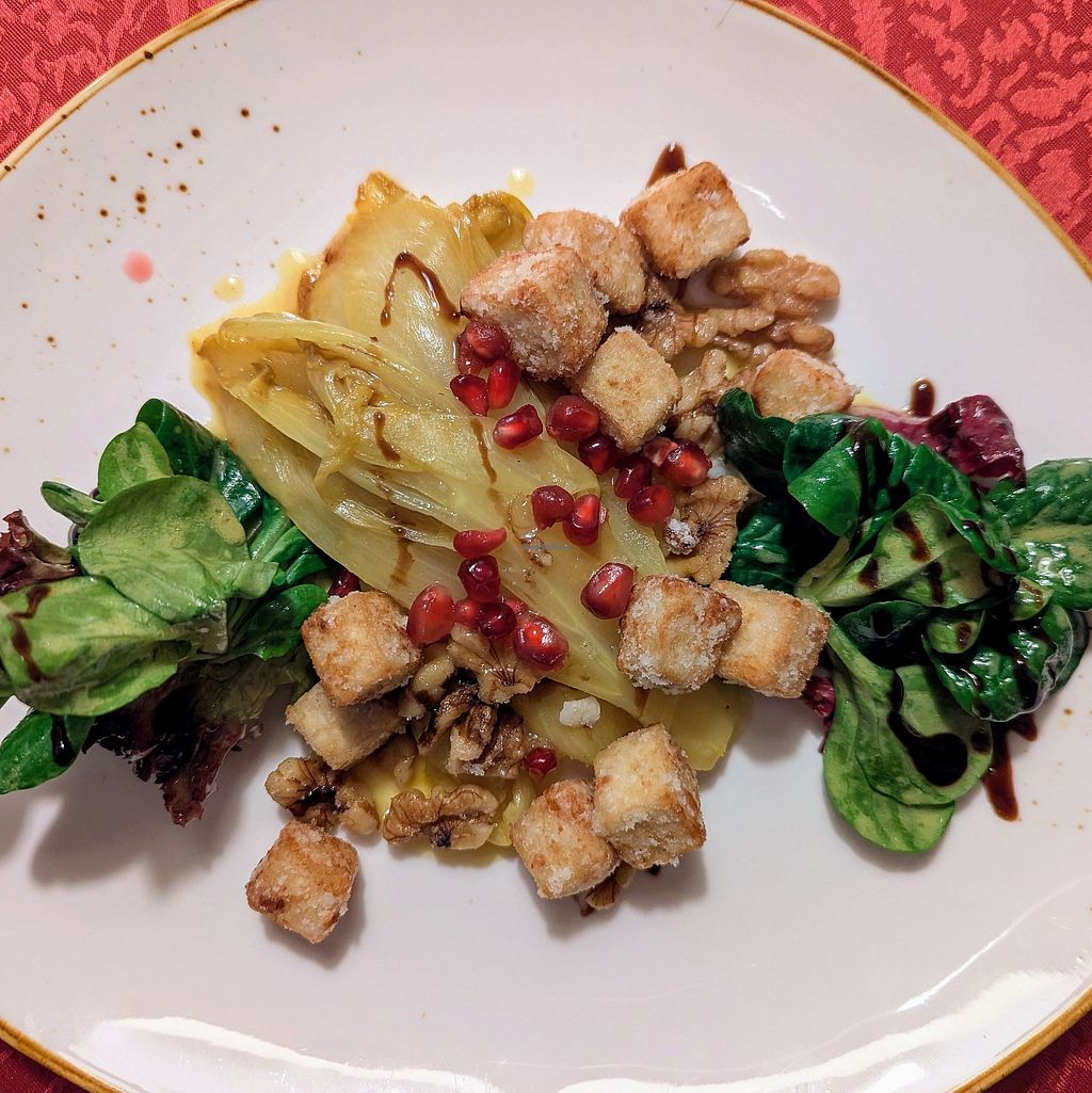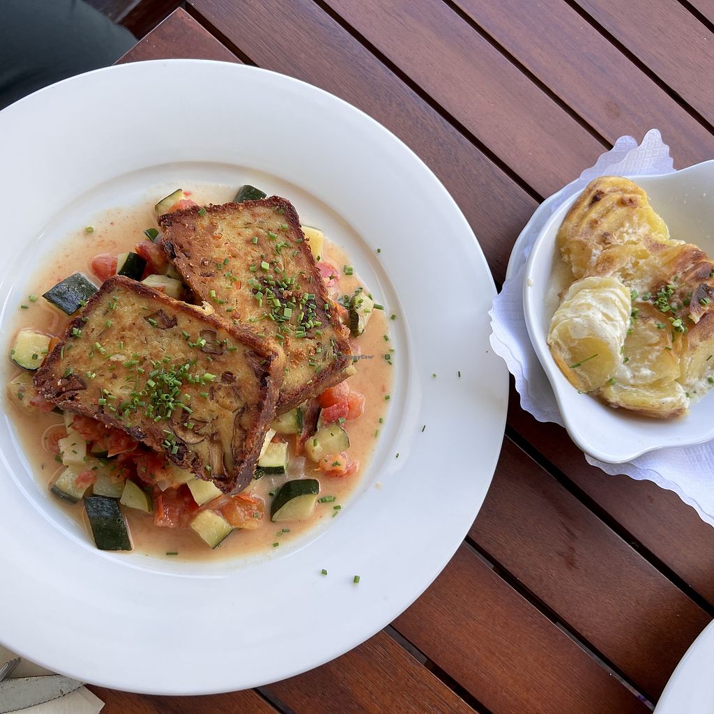 Gebackene Pilz-Kichererbsen-Schnitte mit Preiselbeer-Chutney und gebra…