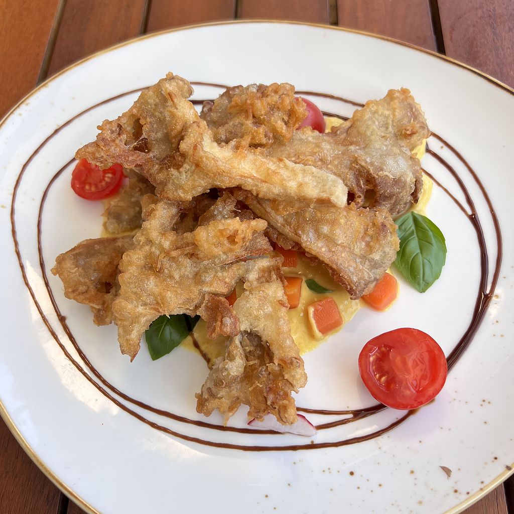Zitronengraspolenta, Brechbohnen, Zwiebeln und Petersilienwurzel