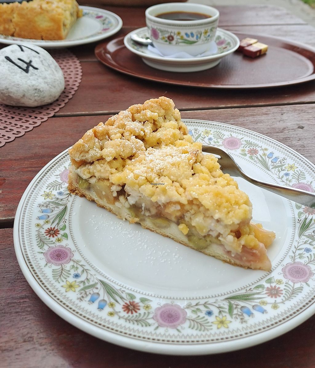 Drei vegane Hauptgerichte zur Auswahl und ein veganer Kuchen auf der Tageskarte, man sitzt sehr schön im Biergarten, freundliche Bedienung