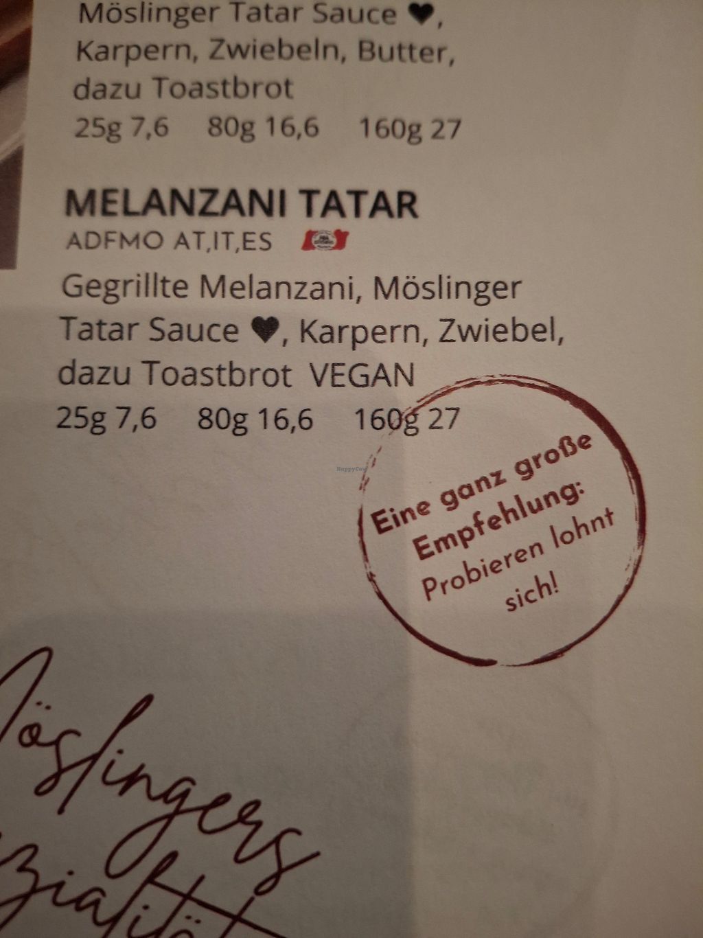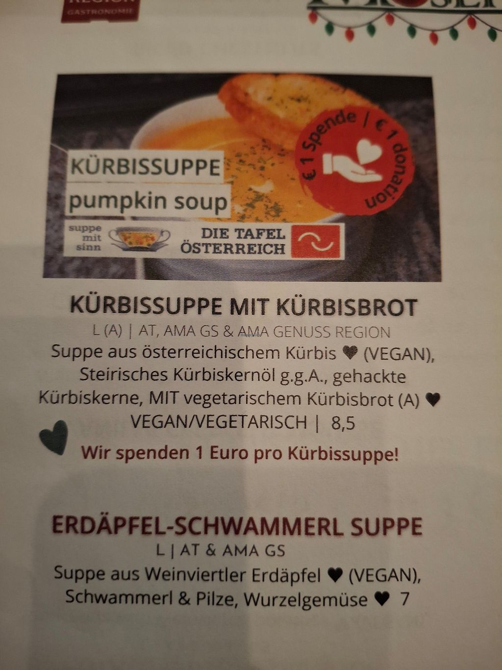 Serves meat, vegan options available. Traditional Viennese restaurant. Vegan options are marked in writing. Choices could include pumpkin soup. gnocchi with vegetables, and chocolate mousse. Open Wed-Sun 12:00-23:00. Closed Mon & Tue.