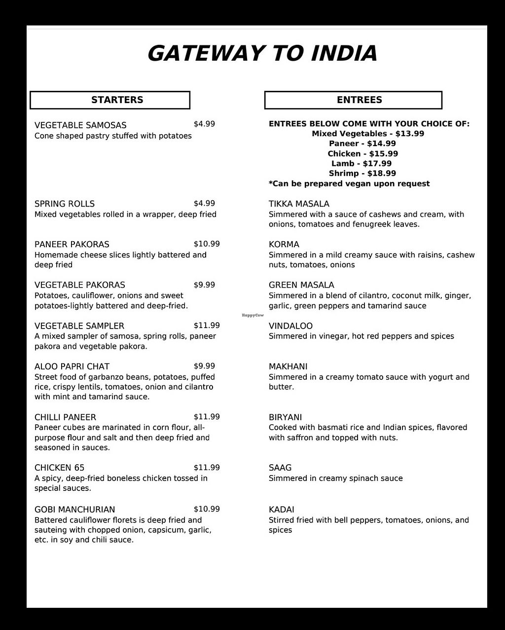 Mushroom Masala Wala, Chana Masala, and Bhindi Masala are all very good. The samosas and spring rolls are vegan, and the vegetable pakoras are out of this world!