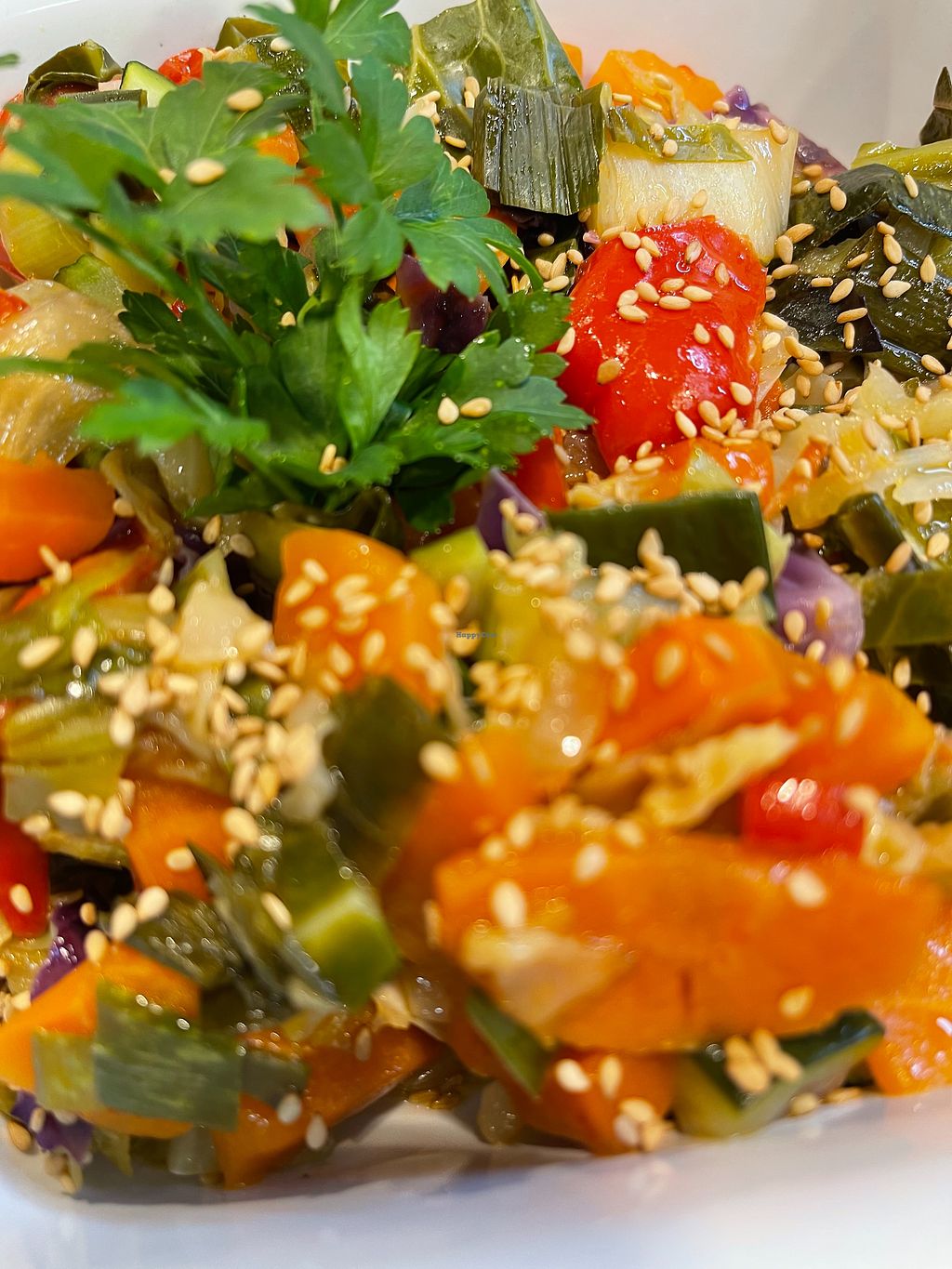 Sweet potatoe bruschetta with mixed vegetables and spinach