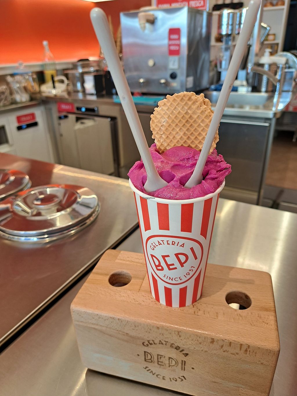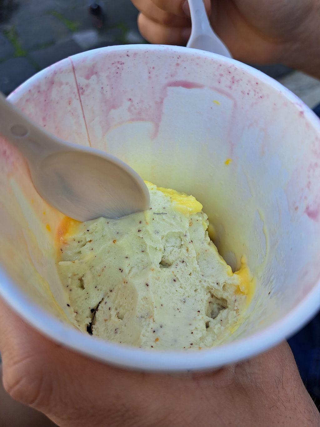 Ci sono gusti frutta buonissimi veg, tutta la frutta è di alta qualità. Purtroppo non ci sono spesso creme veg, a parte il cioccolato, però almeno ci sono sempre numerosi gusti frutta buonissimi e rari. Per esempio banana, avocado, pistacchio e frutta di stagione. Non vendono solo gelato, ma anche altri prodotti quali creme spalmabili (gianduia è veg), liquori di loro produzione, e molto altro