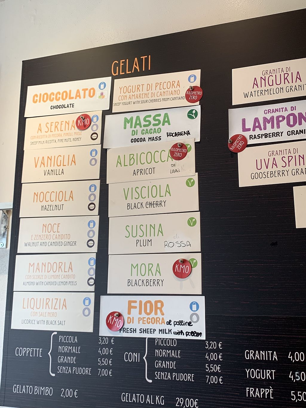 Ice cream list, vegan ones clearly marked in green