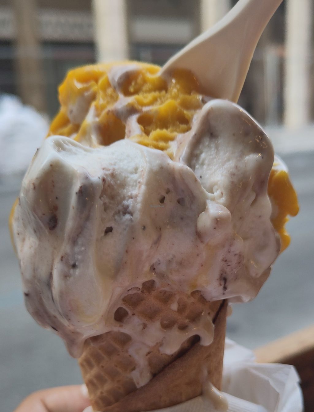There are a few vegan flavours mainly fruit. More creamy “milky” flavours are vanilla and chocolate. The price is ok, 2,50€ for 2 scoops. The fruit flavours taste a bit artificial. But the vanilla one was yummy.