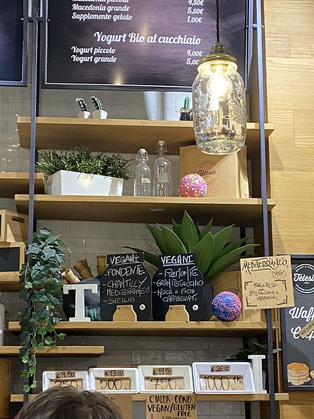 Ha alcune opzioni vegane fra i gusti del gelato, come cioccolato fondente, nocciola e pistacchio. Ha anche il cono vegano (su richiesta) e senza glutine.