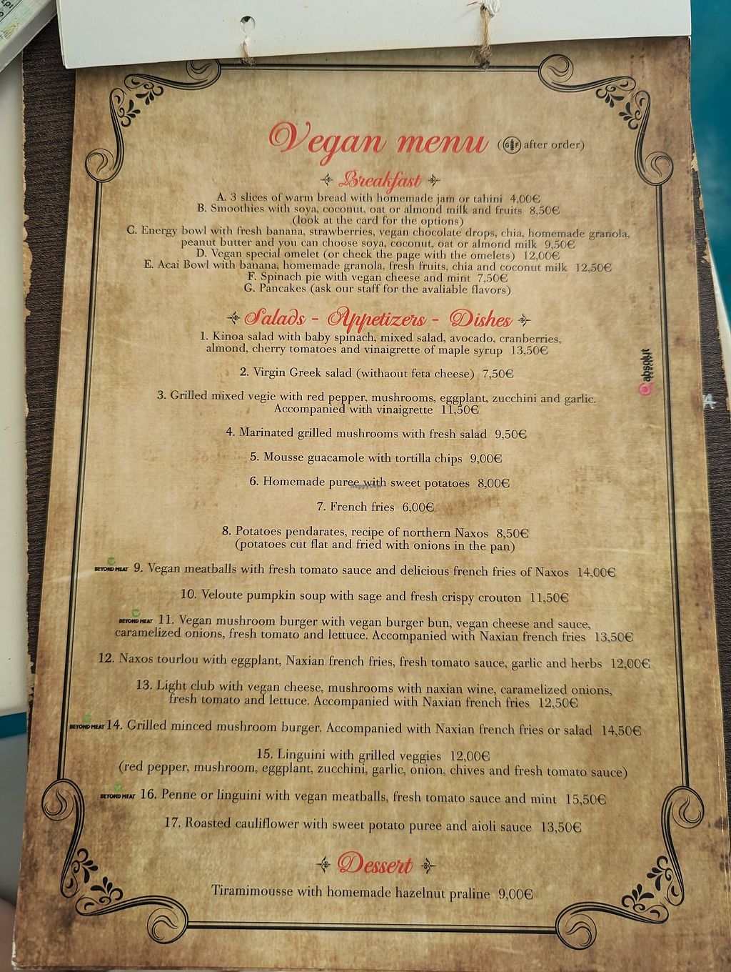 Separate vegan menu