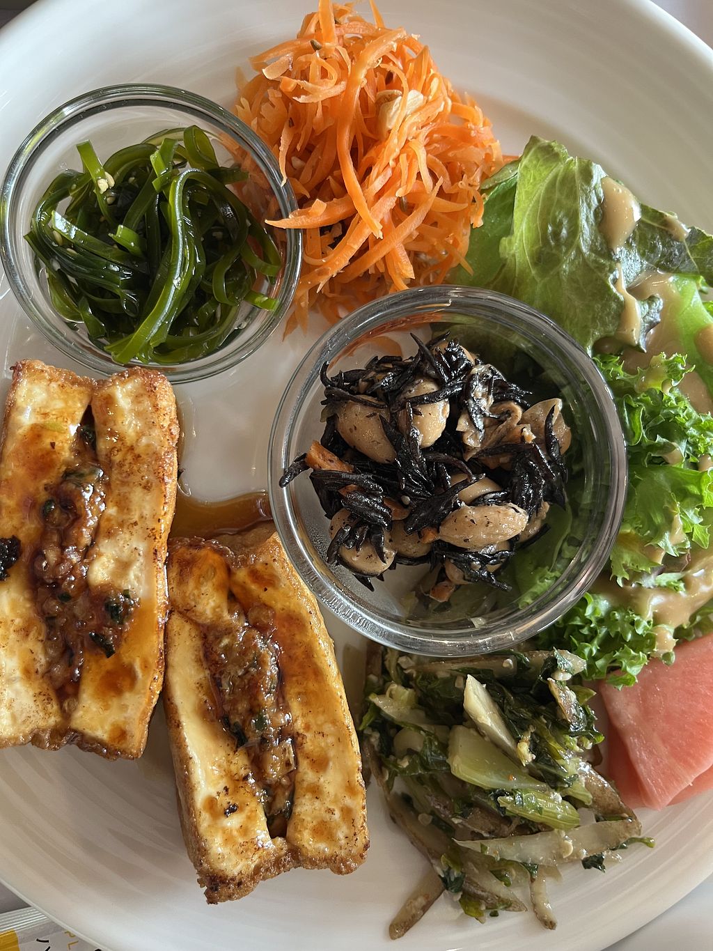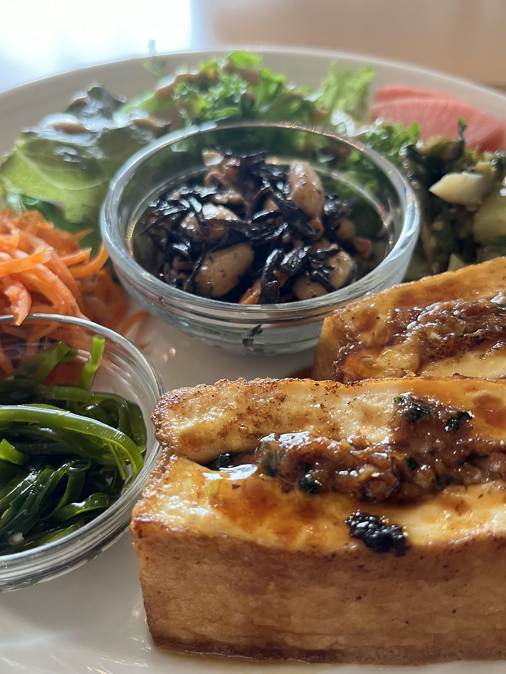 After drinking a little too much last night, I wanted a healthy and hearty brunch, and this place really hit the spot. The portions look small but they’re super filling. There’s a rotating set menu (you can check a list to see what the day’s option is) or a few non-rotating foods. I got the set dish with four small side dishes and it was wonderful. The set meal was two delicious pieces of tofu with what seemed similar to tartar sauce. The small dishes were unique and varied and I enjoyed them all. The tea that comes with the menu is also nice. My dining partner enjoyed the curry a lot as well.