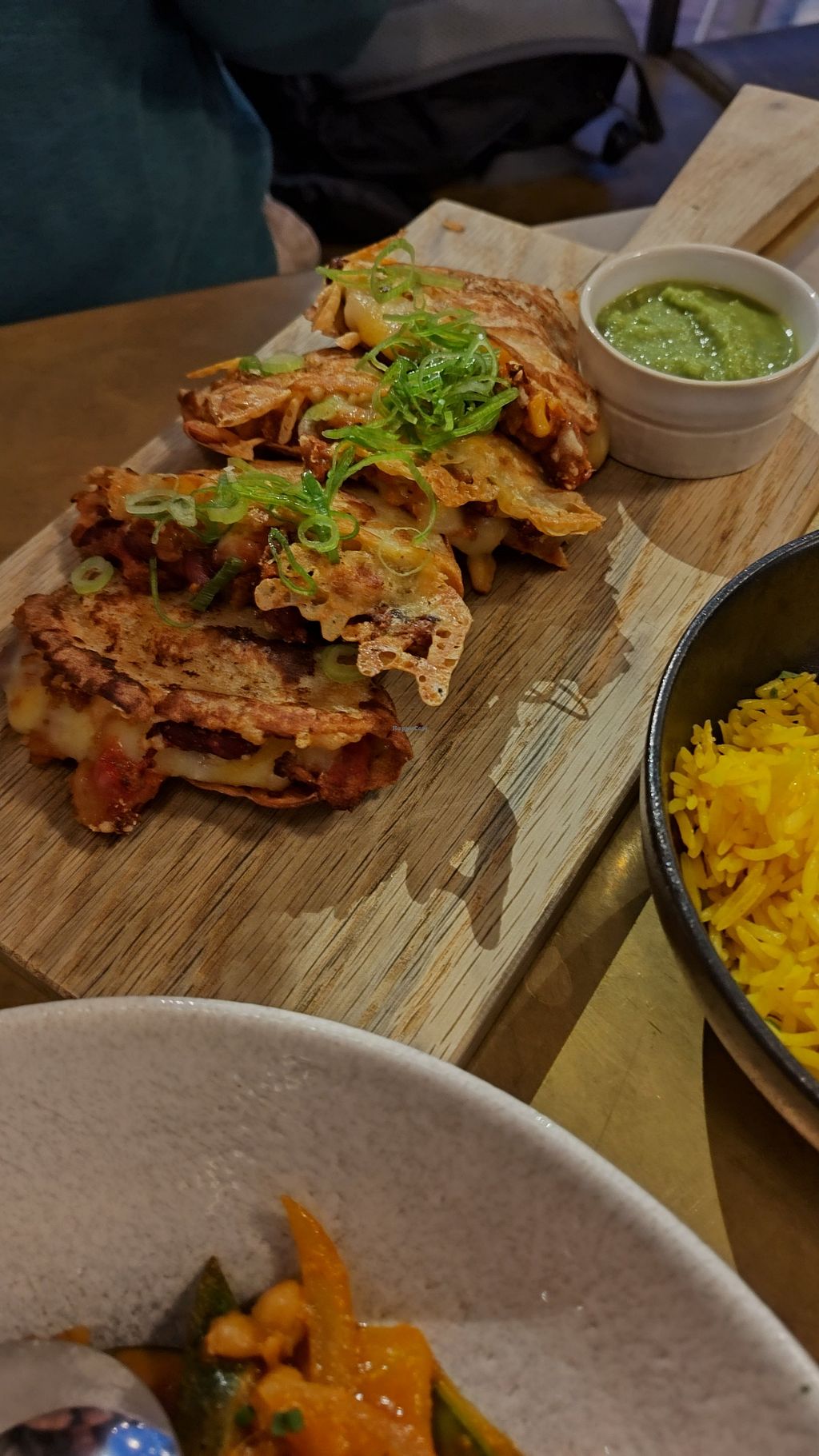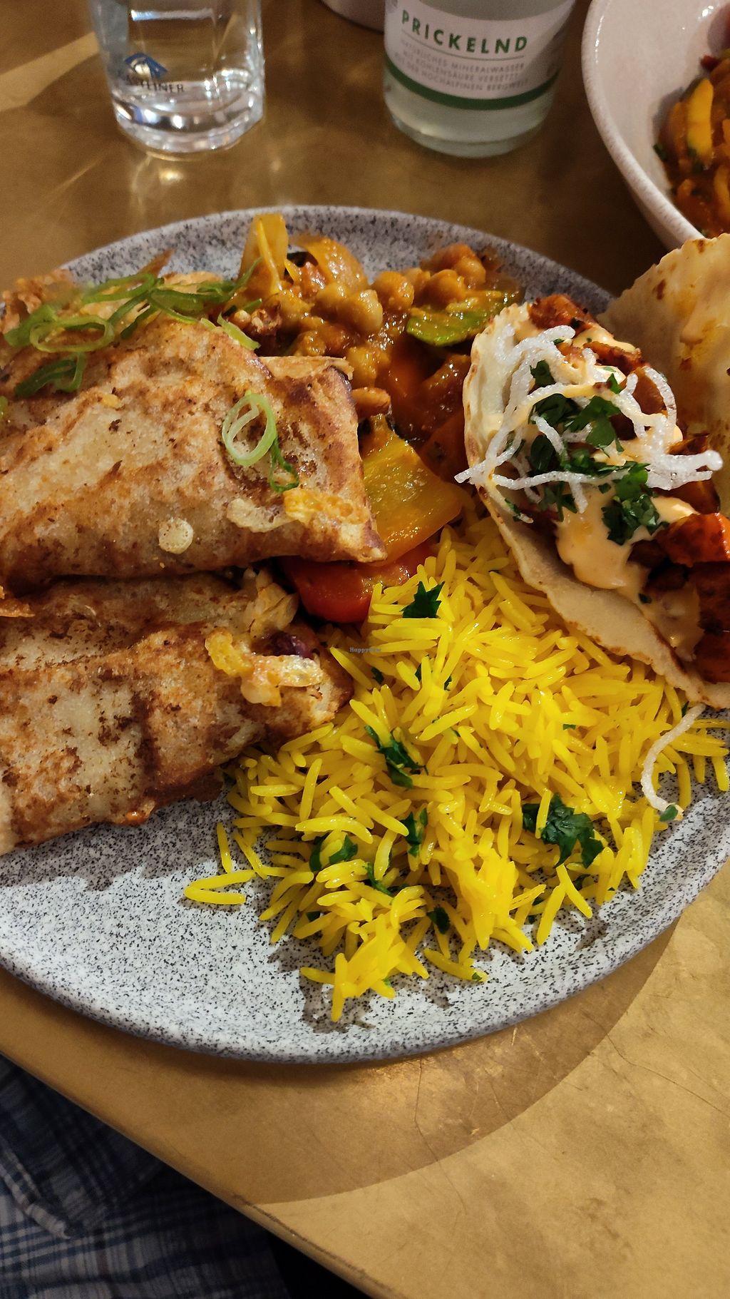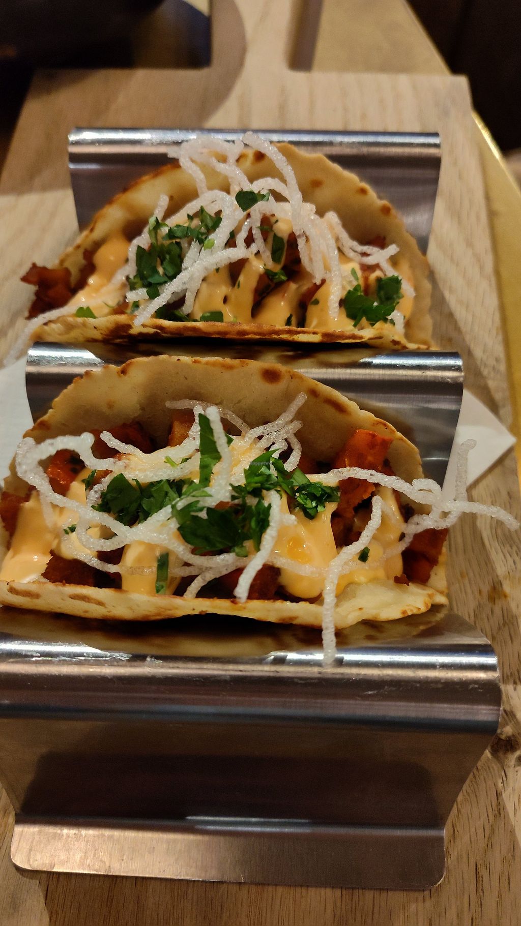 pictured: all vegan tacos, vegan loaded fries, vegan nuggets on the le…