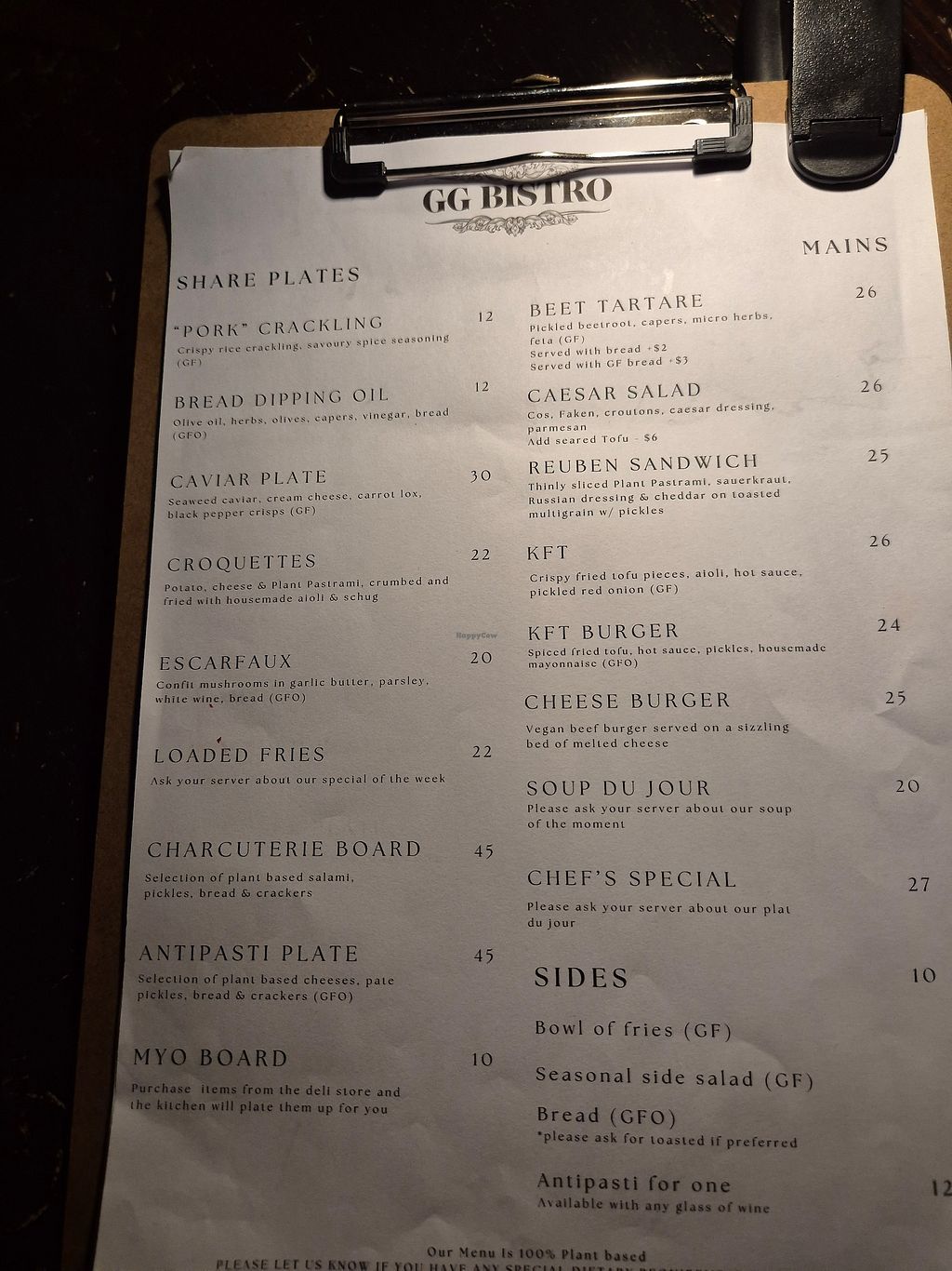 100% vegan, good flavour (we got the KFT chips) but partner found the seitan to be a bit too much. Price also seems a bit expensive for what it is, but after looking at the menu online we had a feeling no prices meant higher prices. We are not fine diners by any means so take “expensive” as you will.