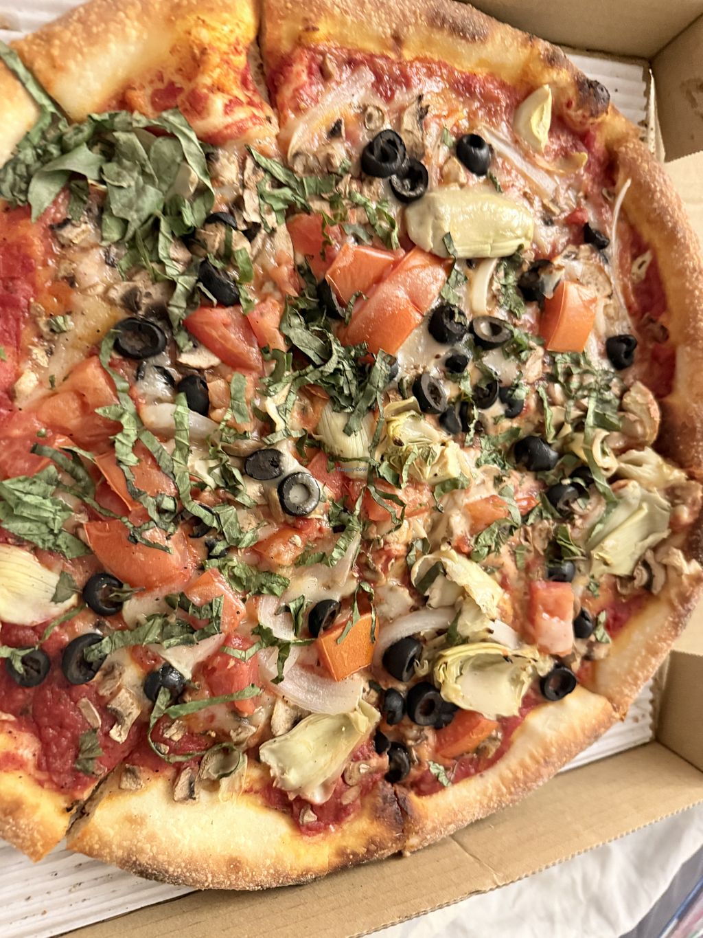 Pizza with both vegan cheeses, artichoke, kalamata olives and roasted …