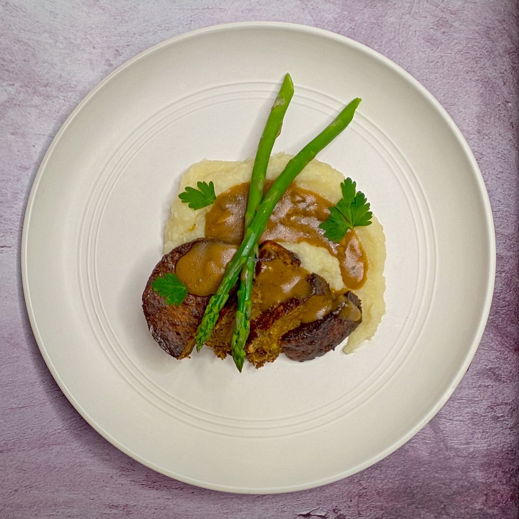 Neatloaf! Impossible & red lentil protein, roasted garlic mash, miso m…