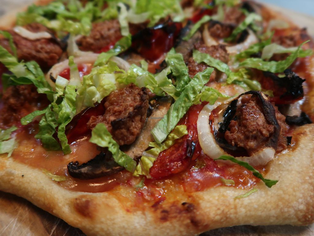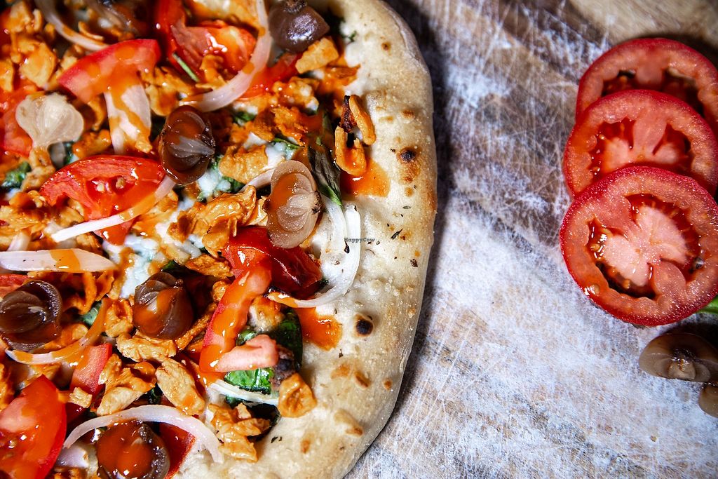 Buffalo '66 Garlic/olive oil base, vegan buffalo chicken, tomato, onio…
