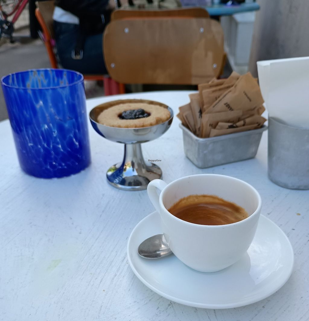 Read moreIo ho preso solo un caffè al volo, accompagnandolo con un biscotto vegano alla marmellata di mirtilli, che era buono ma non pazzesco (però sembrava artigianale). Avevano anche una crostata vegana alla marmellata di arance con un bell'aspetto.