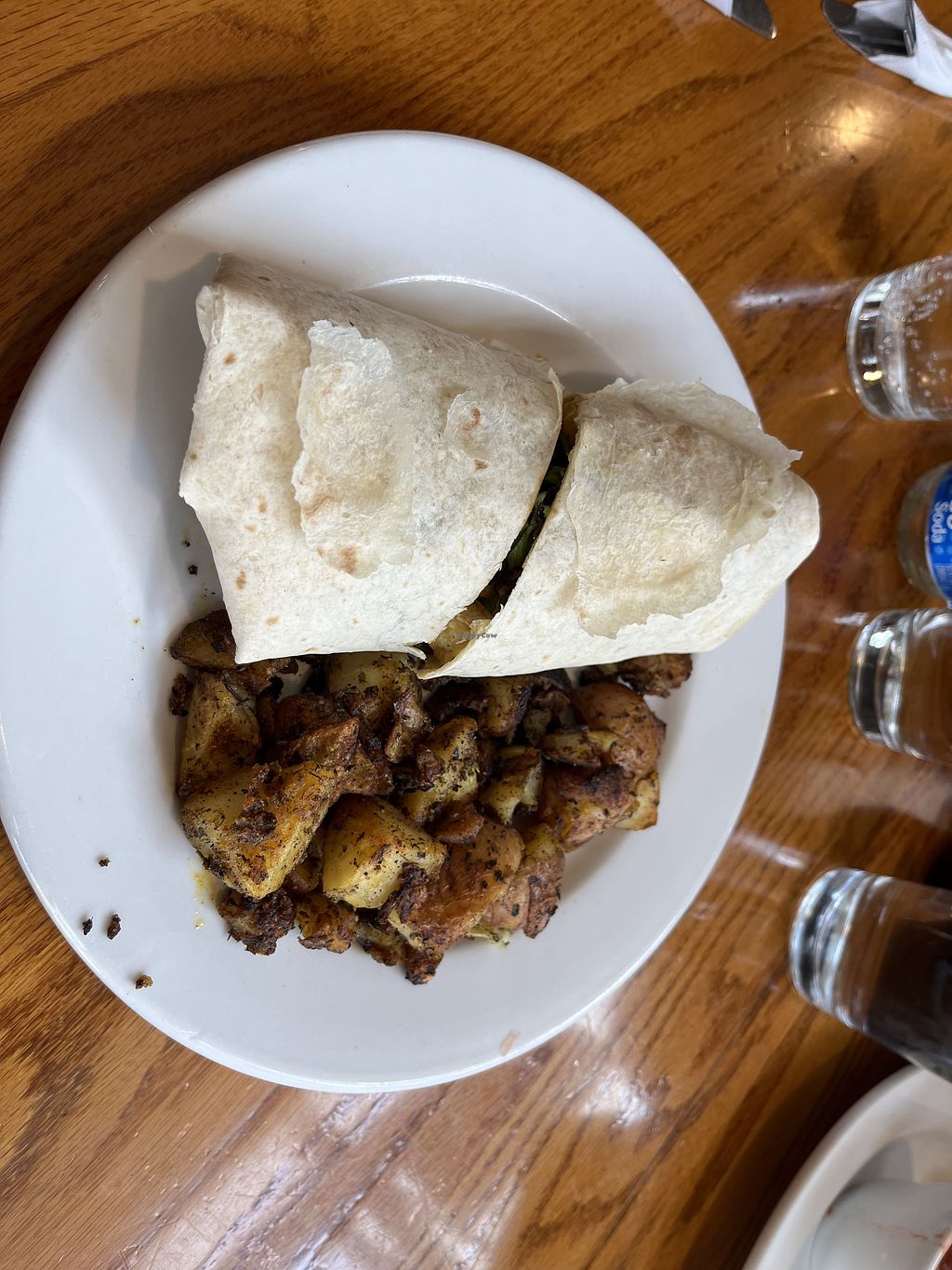 Buckwheat pancake, tofu, potatoes, salsa and french bread. All very go…