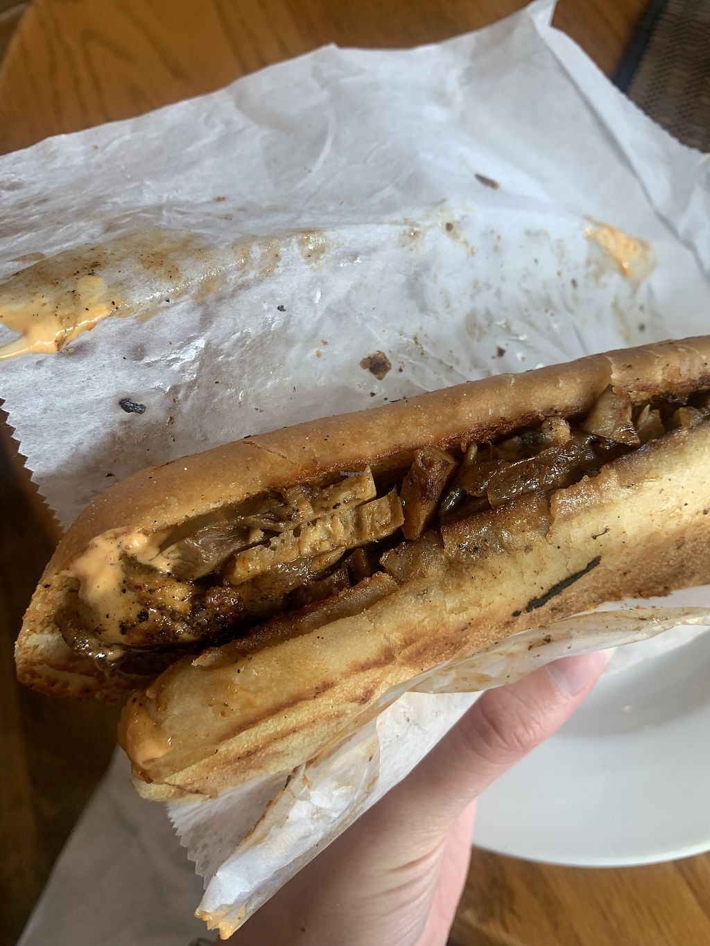 The vegan crabcake sandwich with potatoes at Gilleys. Delicious.