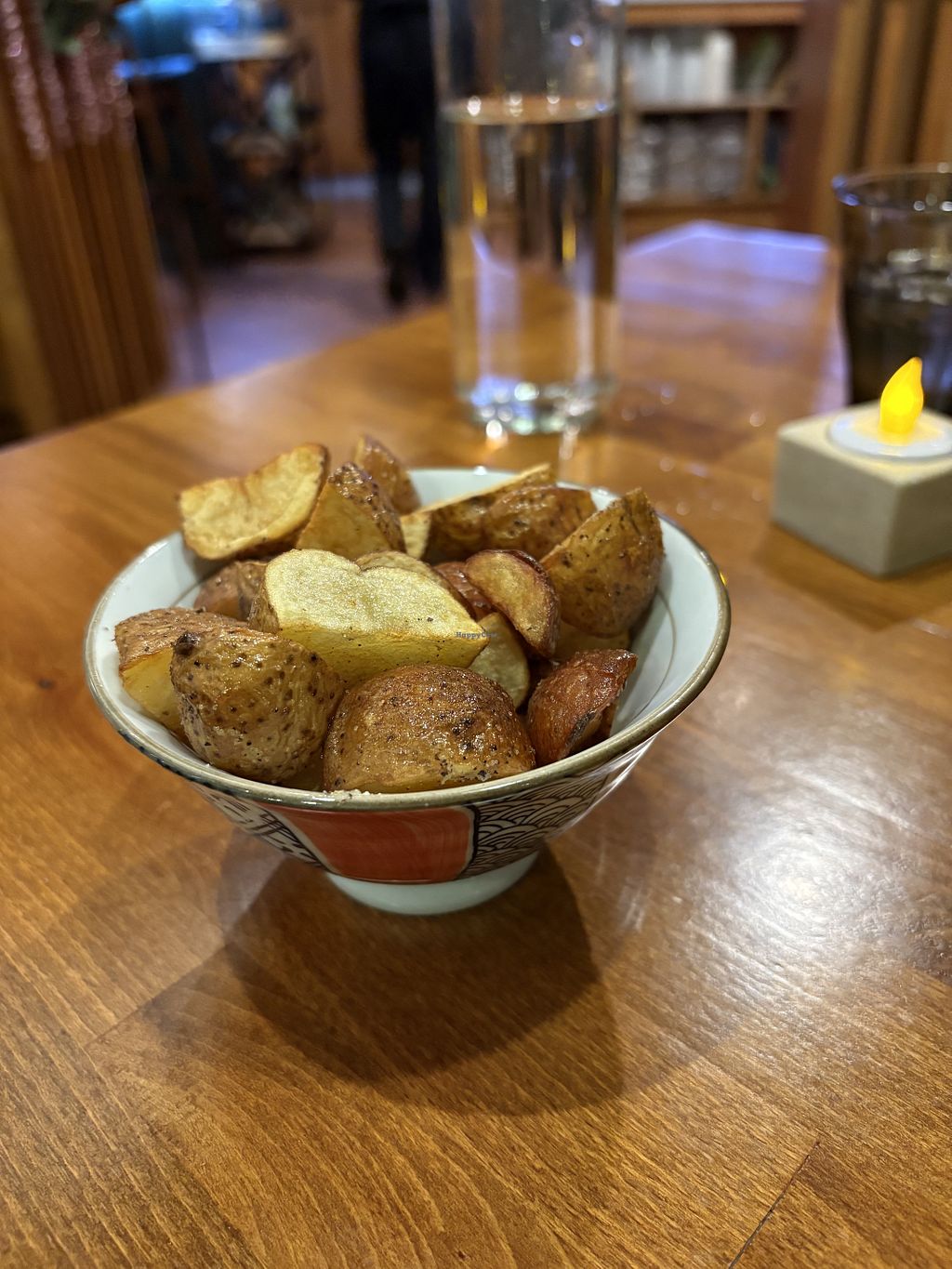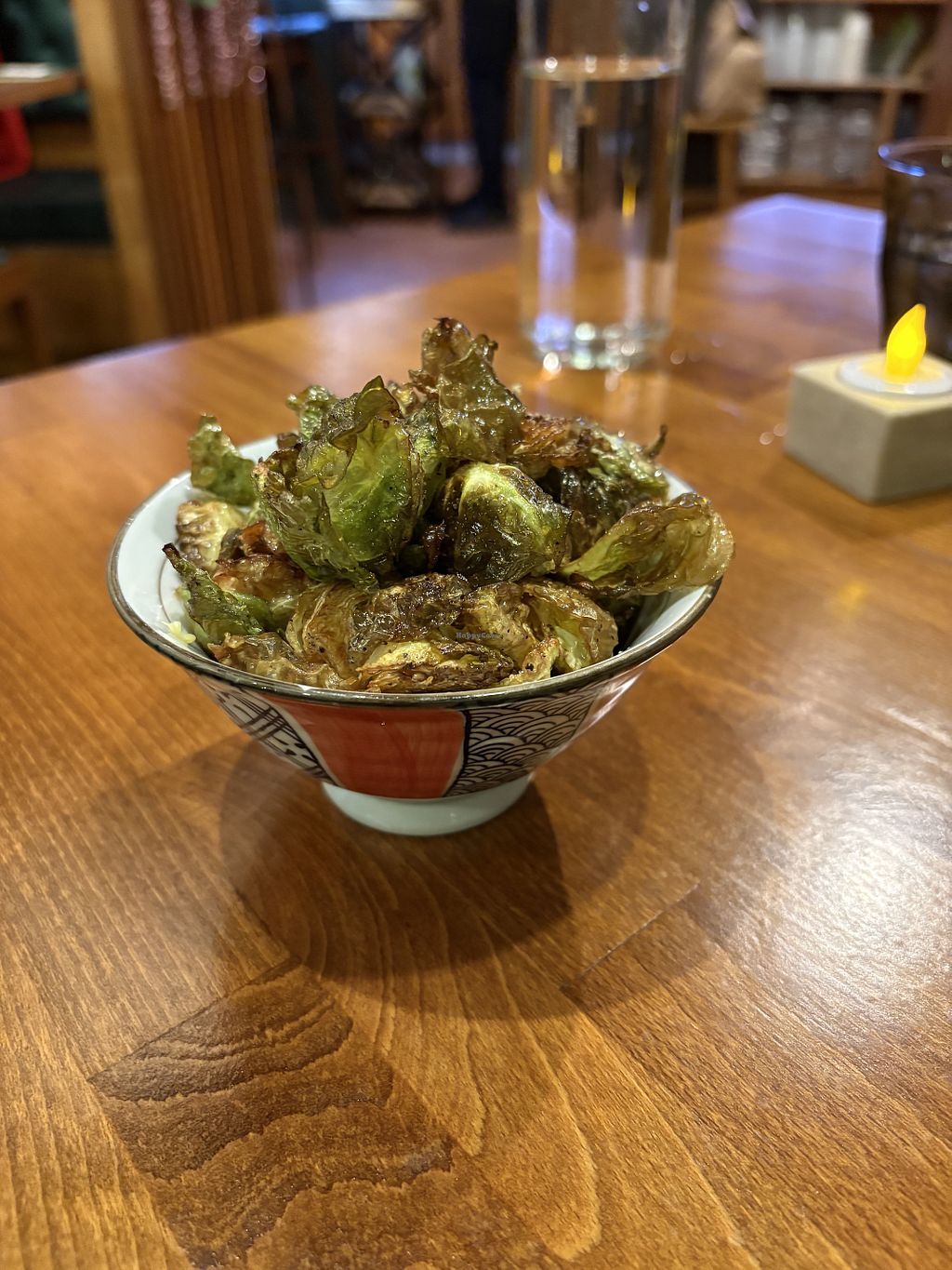 This place is small but cute, has both tables and a bar area. The vegan options are clearly marked on appetizers and main dishes. The sides weren’t clearly marked as vegan or not but the staff was knowledgeable about what was vegan both on the list of sides and their seasonal menu.