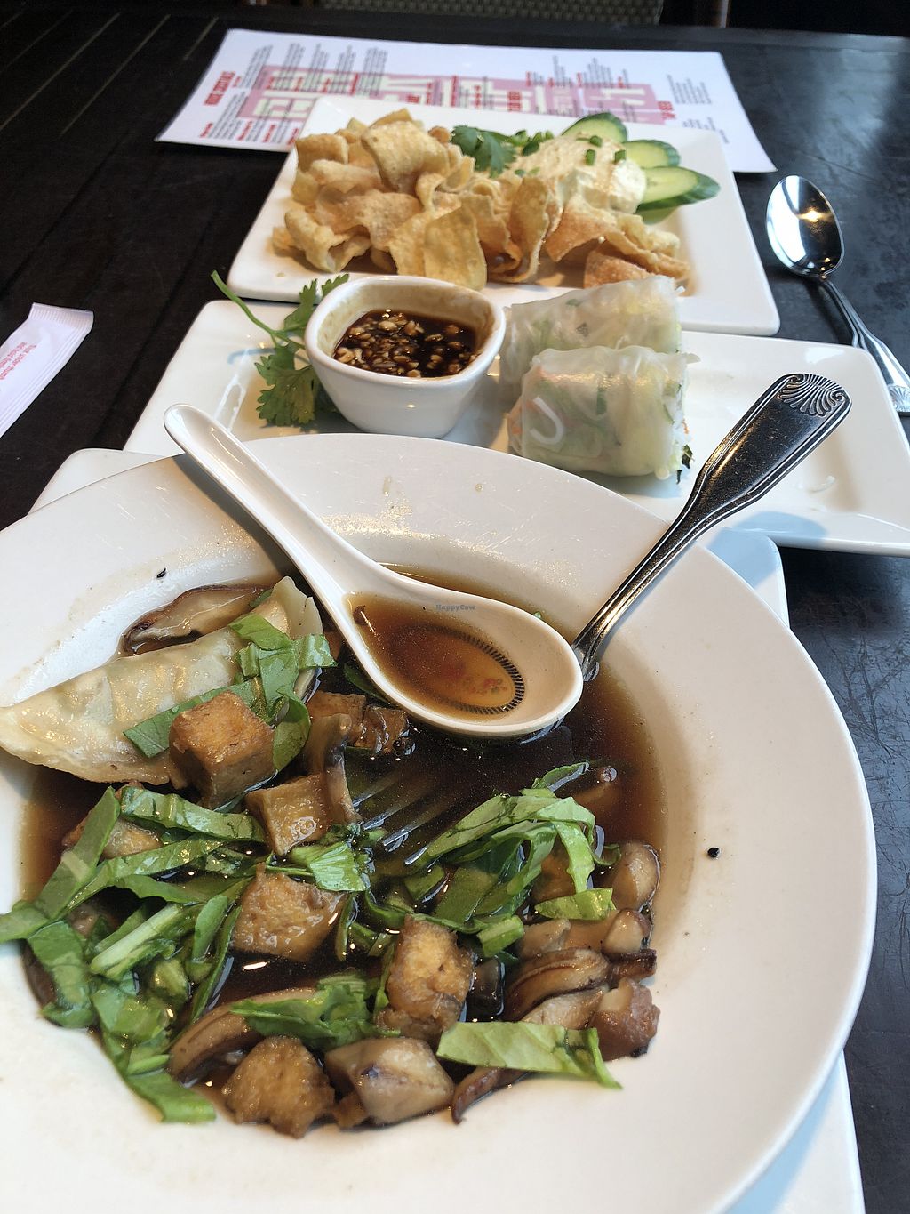 Potsticker soup, spring roll, jalapeño hummus