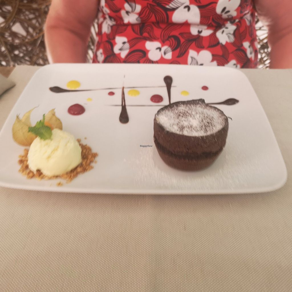 We ordered a table in advance and were glad we did, because the restaurant was filled during the whole evening. The menu showed (except very few vegetarian options) all vegan and/or raw/glutenfree dishes. It was very hard to decide what to order, because every dish sounded tasty! In the end we decided having Sushi/ThaiRolls/Quinoa salad for starter, 1st course ravioli, special penne , seitandish and fennel w. bechamel as side dish. Dessert we all had the chocolate lava cake with vanilla ice cream and a coffee. 2 of us shared a bottle of a tasty bio wine and 2 bottles water. Totally we (4 people) have had payed around €220 for drink&food. Prices are higher but fair for that region and especially to mention that all food is freshly made. We waited for every course about 1/2-1h, but it‘s absolutely worth it - you will get very fresh and selfmade food!!! Our carnivore friends even liked the food very much and said that they have had the best „penne“ in whole Sardinia!! Nice ambiente! We definitaly would come back! They have some Happy Hour during afternoon (€10?!).
