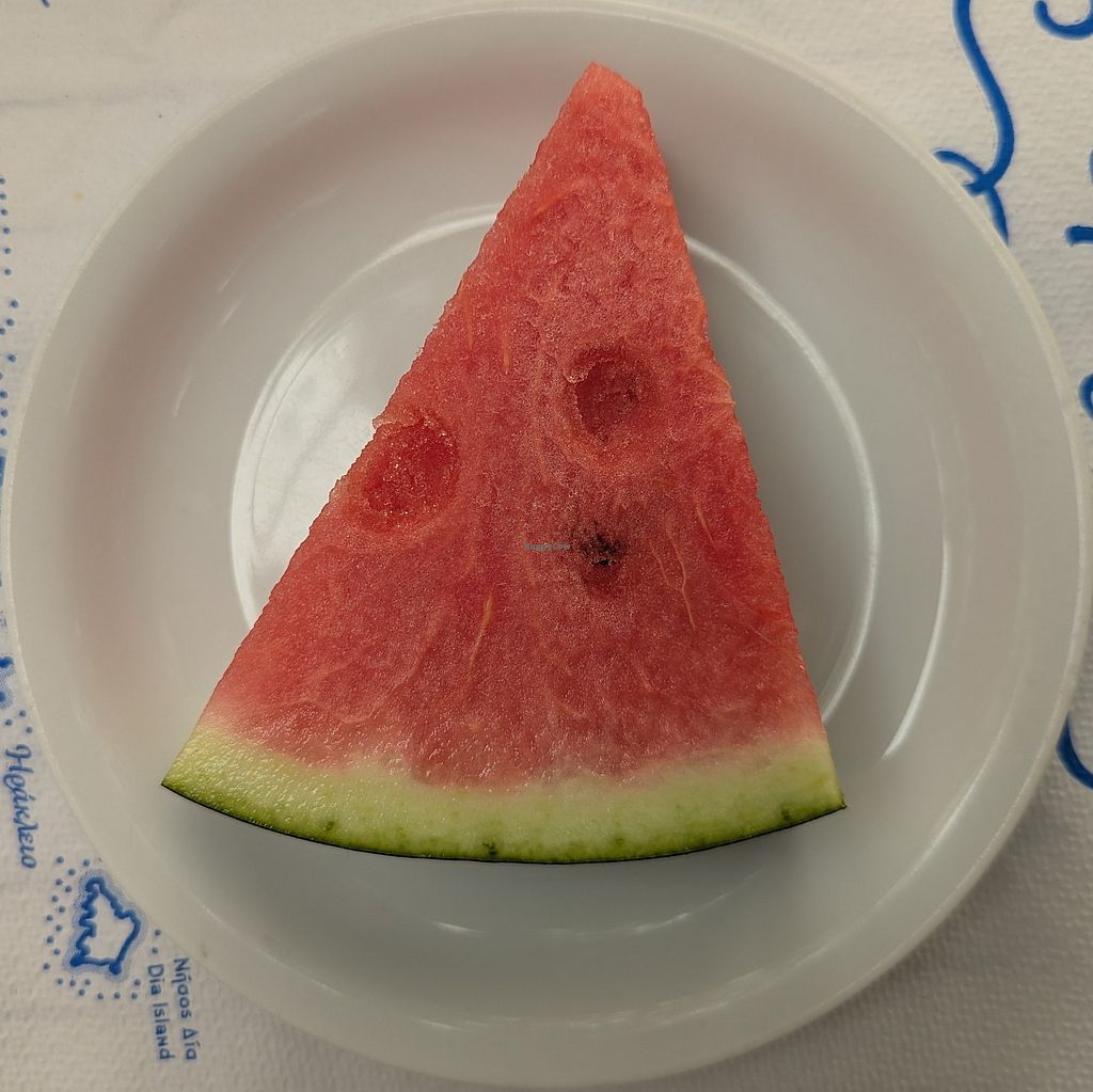 We sat outside with a view of waves crashing on rocks. The bread was served with olive oil and two breadsticks. The Mixed Seasonal Salad included greens, cucumbers, tomatoes, bell peppers, figs, pepitas, sunflower seeds, sesame peanuts, and vinaigrette. The Fava was yellow split pea puree with onions, capers and parsley. We ordered the Dolmadakia (stuffed vine leaves) without yogurt. The Giant Beans were a special. They gave us free watermelon at the end of our meal. Everything was so tasty.